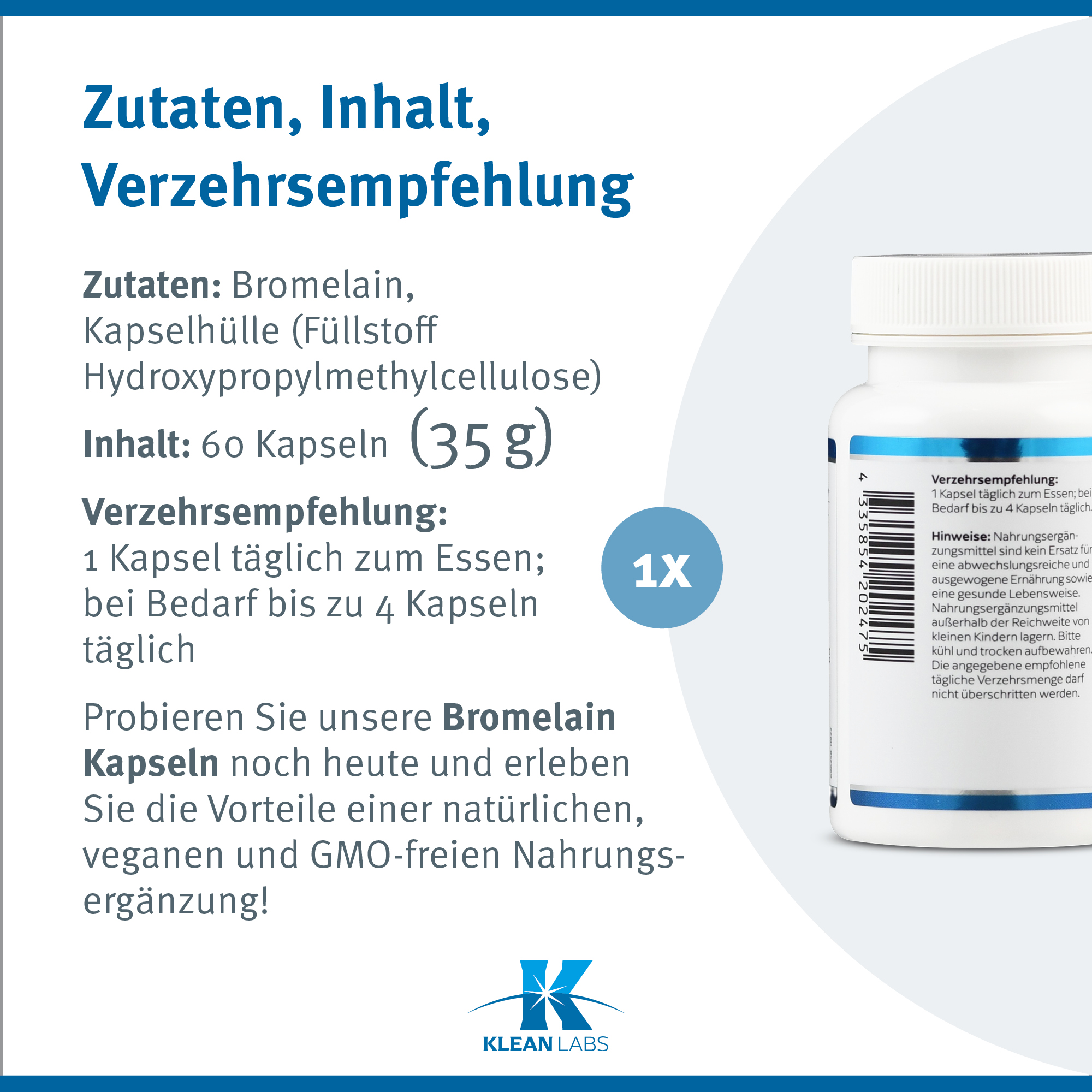 Die Bromelain-Kapseln von Klean Labs sind ein hochwertiges Nahrungsergänzungsmittel, das aus der Ananas-Pflanze gewonnen wird. Jede Kapsel enthält 500 mg natürliches Bromelain und ist zu 100 % vegan und GMO-frei. Bromelain bezeichnet eine Verbindung aus zwei eiweißspaltenden Enzymen, welche natürlicherweise in der Ananaspflanze vorkommt.