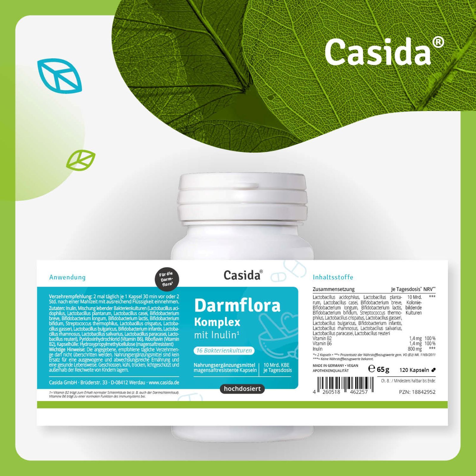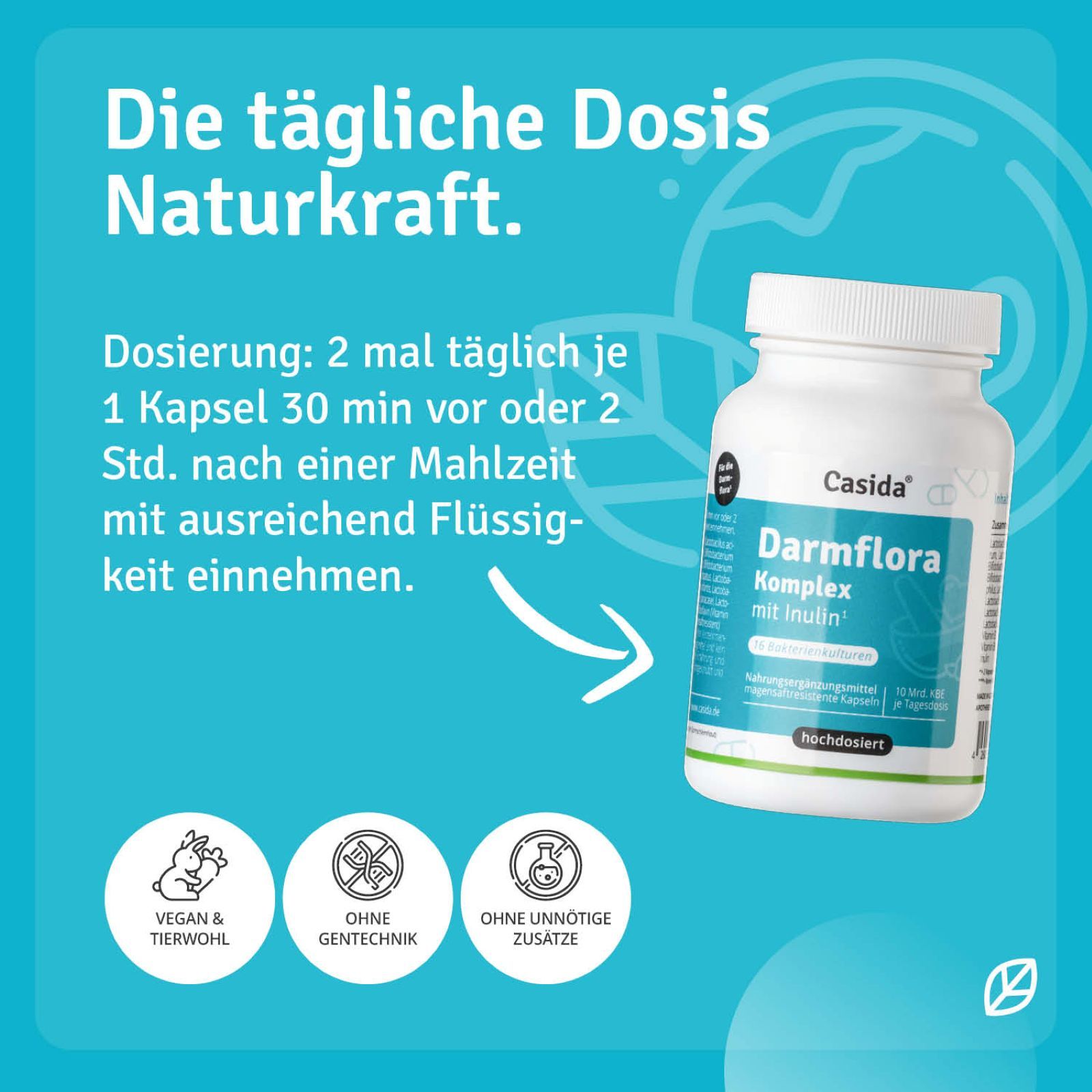 • Mit 10 Mrd. koloniebildenden Einheiten (kbE) je Tagesdosis (2 Kapseln) leisten die Darmflora Komplex Kapseln einen wertvollen Beitrag zum Aufbau und zur Pflege der gesundheitsfördernden Bakterien des Mikrobioms.