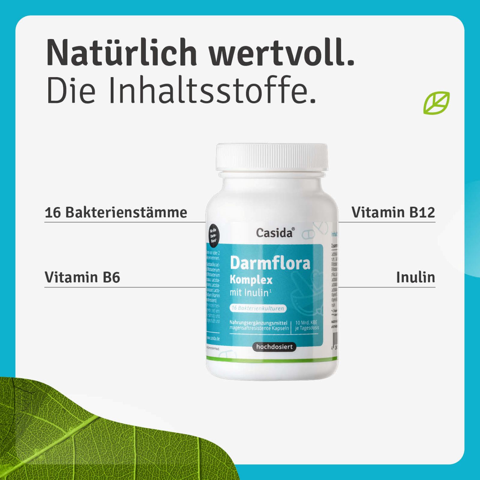 • Der Darmflora Komplex mit Inulin enthält 16 sinnvoll kombinierte Bakterienstämme.