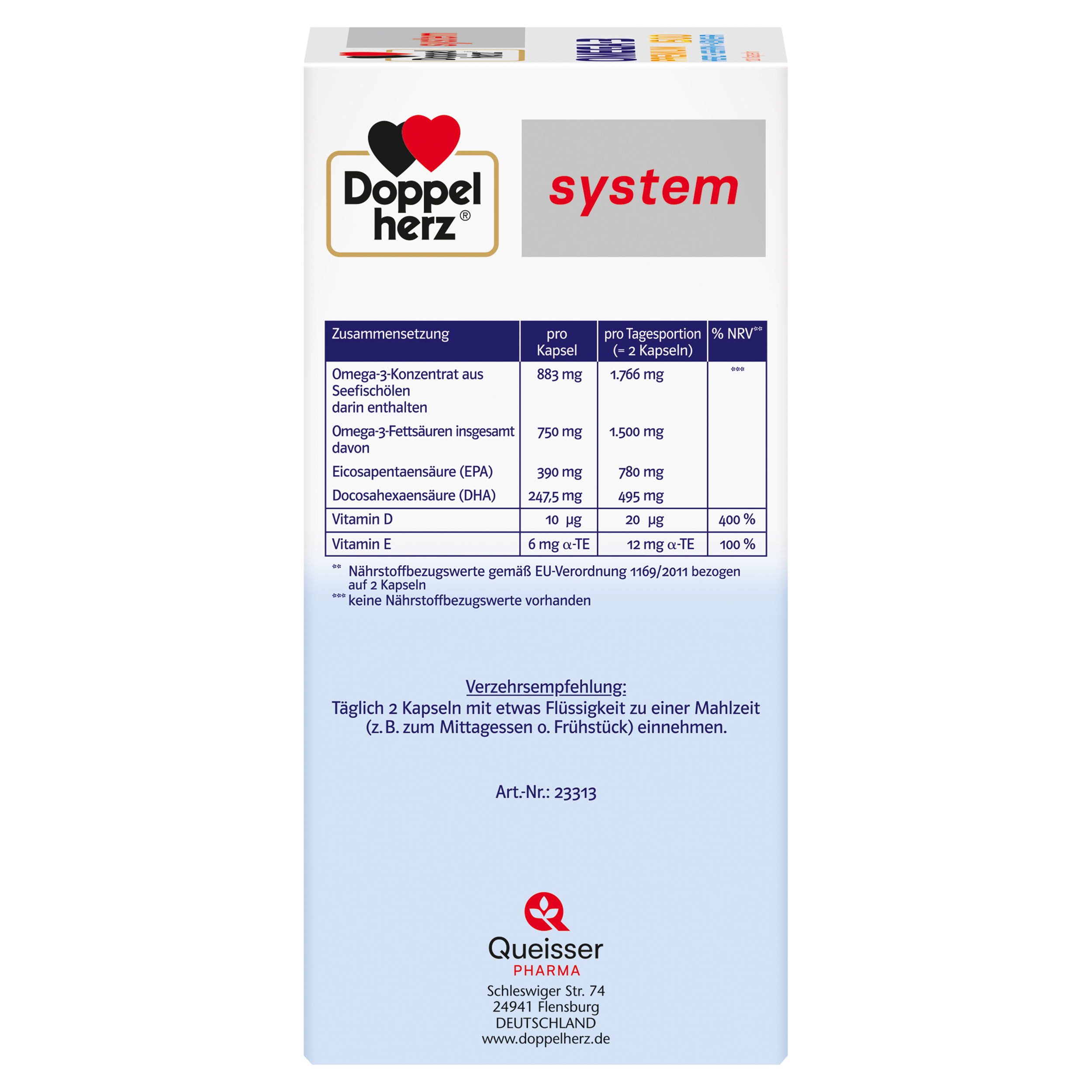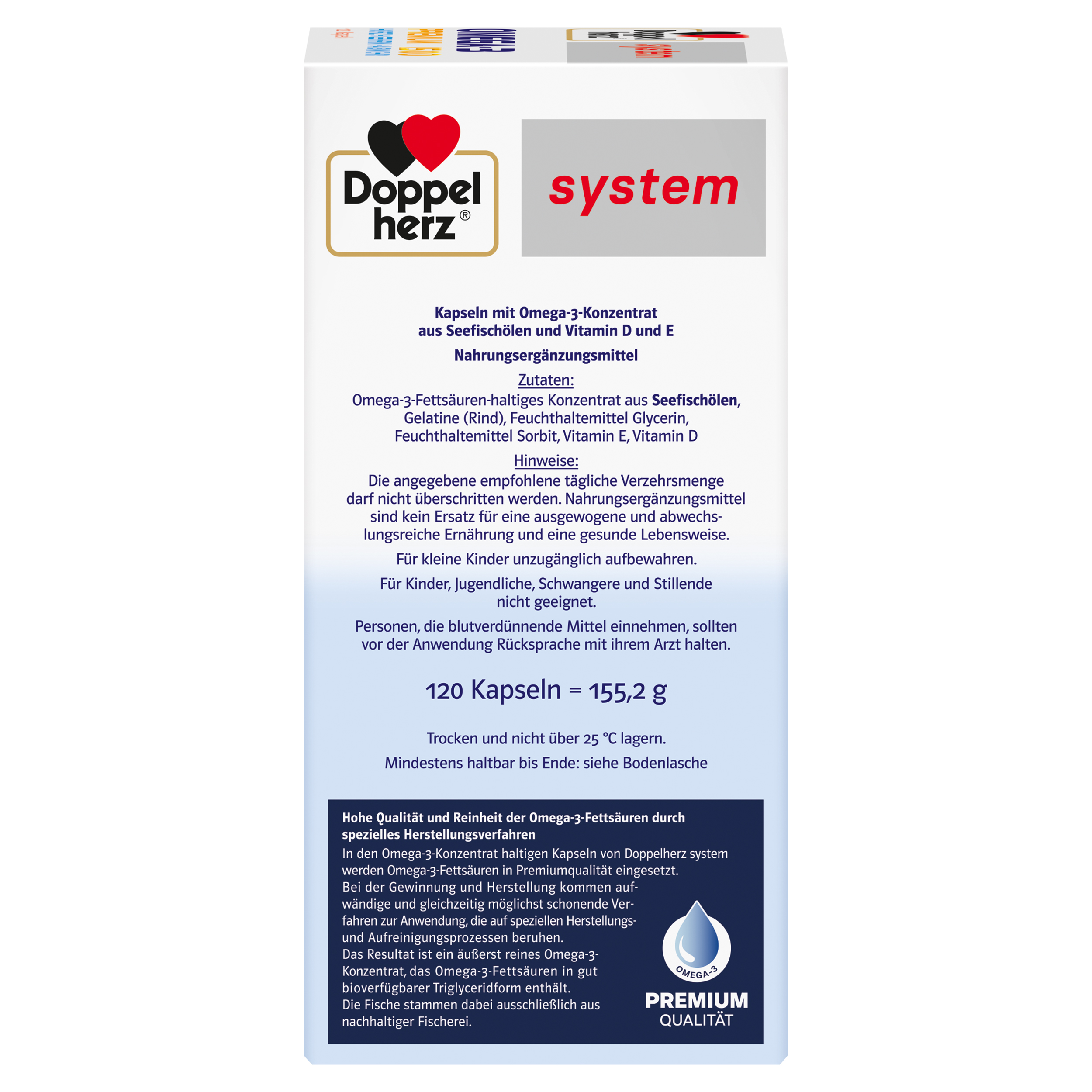 Doppelherz system OMEGA-3 PREMIUM 1500 Kapseln enthalten ein hochgereinigtes Konzentrat aus Seefischölen mit den wertvollen Omega-3-Fettsäuren EPA und DHA in Kombination mit Vitamin D3 und E. Durch die hohe Konzentration an Omega-3-Fettsäuren liefern bereits zwei Kapseln täglich 1.500 mg Omega-3-Fettsäuren, davon 780 mg EPA und 495 mg DHA. Dadurch kann auch bei einem erhöhten Bedarf eine gute Versorgung mit den wertvollen Omega-3-Fettsäuren unterstützt werden. Omega-3-Fettsäuren sind ein wichtiger Bestandteil einer gesunden Ernährung. Dennoch ist die Versorgung mit diesen langkettigen mehrfach ungesättigten Fettsäuren nicht bei allen Menschen optimal. Die Omega-3-Fettsäuren EPA und DHA tragen bei einer täglichen Aufnahme von 250 mg zur normalen Herzfunktion bei. DHA leistet bei einer Aufnahme von 250 mg täglich zudem auch einen Beitrag zum Erhalt einer normalen Gehirnfunktion sowie zum Erhalt der normalen Sehkraft. Vitamin D trägt zum normalen Knochenerhalt und zur normalen Muskelfunktion bei. Darüber hinaus leistet es einen Beitrag für die normale Funktion des Immunsystems. Eine Tagesportion (2 Kapseln) enthält 20 μg Vitamin D in Form von Vitamin D3. Dies entspricht 800 I.E. (internationale Einheiten) Vitamin D3. Das zusätzlich enthaltene fettlösliche Vitamin E leistet einen Beitrag zum Schutz der Zellen vor oxidativem Stress. Doppelherz system OMEGA-3 PREMIUM 1500 Kapseln enthalten ein hochgereinigtes Konzentrat aus Seefischölen, sind geschmacks- und geruchsneutral und enthalten keine Farbstoffe. Zur Omega-3 Konzentrat-Gewinnung werden nur Fische verwendet, die aus nachhaltiger Fischerei stammen.