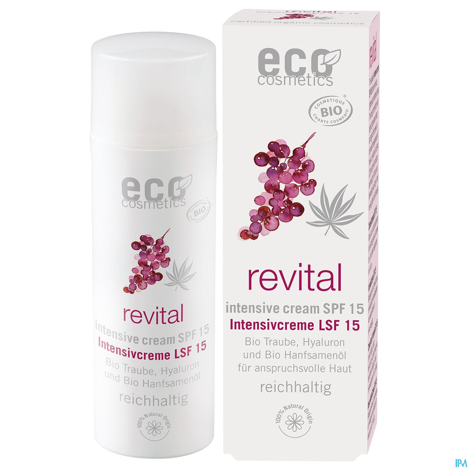 Die ECO revital Intensivcreme LSF 15 mit Bio Traubenkernextrakt, Hyaluronsäure und Bio Hanfsamenöl ist die ideale Tagespflege für anspruchsvolle Haut. Sie mildert Fältchen, strafft und glättet Konturen. Die reichhaltige Intensivcreme mit wertvollem OPC (Oligomere Proanthocyanidine) aus Bio Traubenkernen schützt die Haut vor freien Radikalen und hemmt Oxidationsprozesse. Der Pflegekomplex aus Bio Traubenkernextrakt und Bio Hanfsamenöl fördert die Regeneration der Haut. Hyaluronsäure und Q10 sorgen für Elastizität und Spannkraft. Für einen natürlich-frischen Look. Wertvolle Inhaltsstoffe wie Bio Sheabutter und Bio Kakaobutter pflegen die Haut nachhaltig und versorgen sie mit essentiellen Nährstoffen. Die revital Intensivcreme mit LSF 15 kann auch unter dem Make-Up verwendet werden. Eine Komposition natürlicher, ätherischer Öle verleiht der ECO revital Intensivcreme ihren einzigartigen, angenehmen Duft.