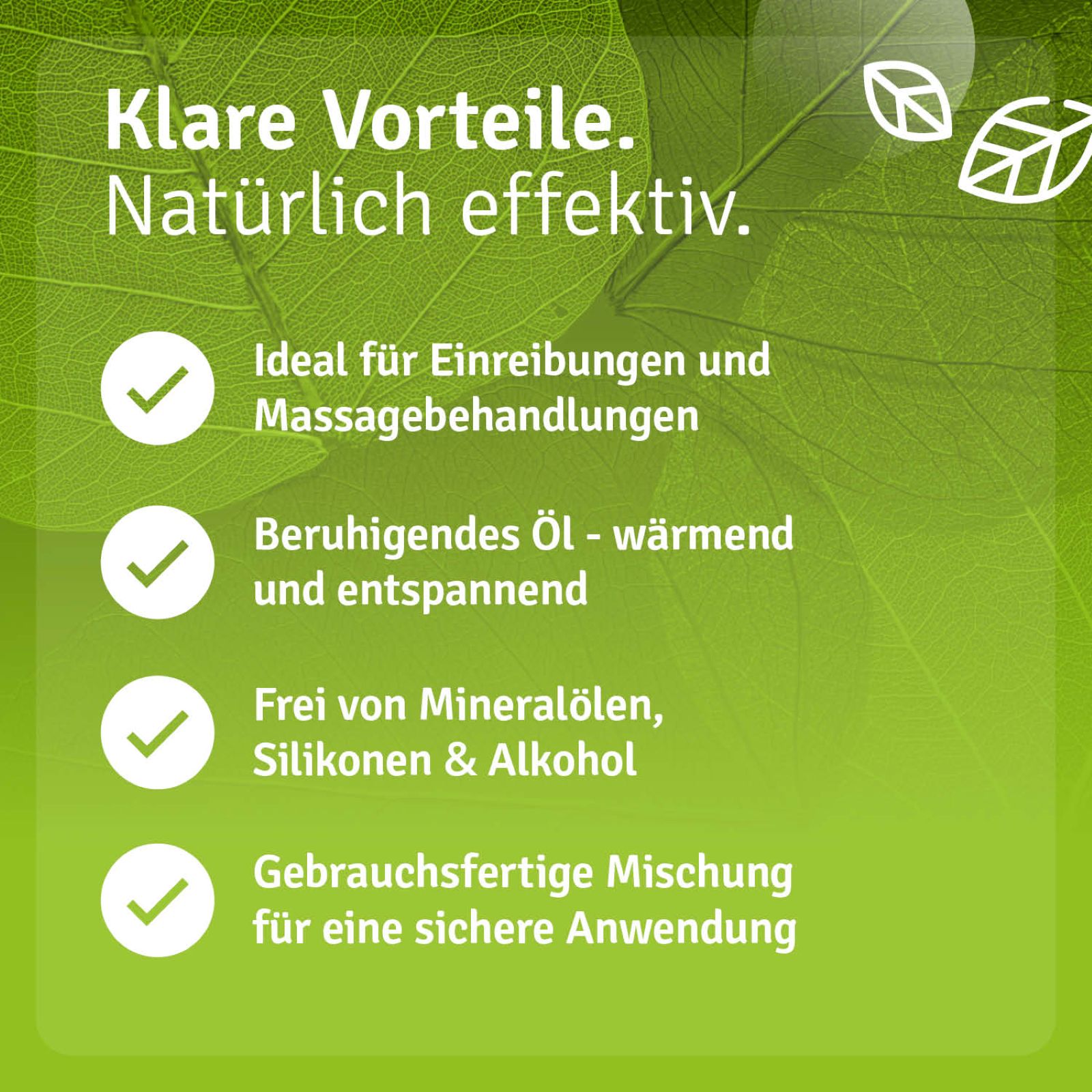 - Für wärmende, durchblutungsfördernde Massagen und Einreibungen