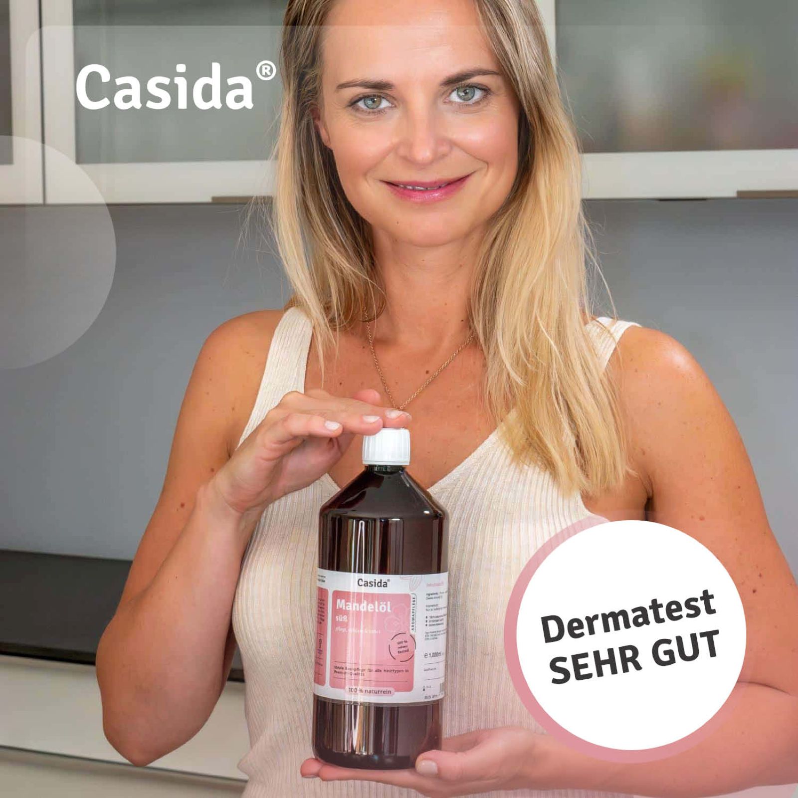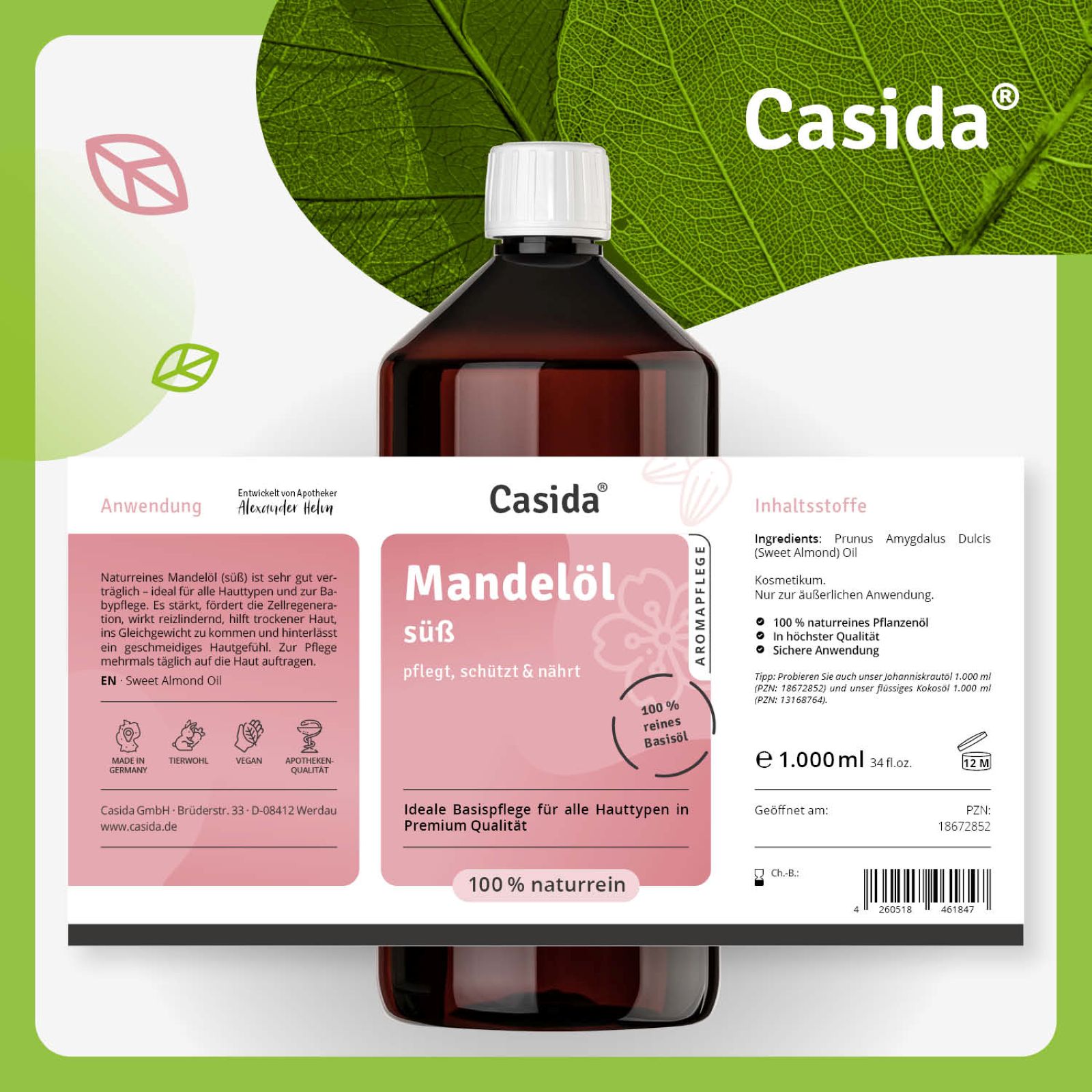 Das Casida Mandelöl Haut amp; Haare ist ein naturreines, unparfümiertes Öl aus den Kernen der Süßmandel. Es pflegt sensible, feuchtigkeitsarme und schuppige Haut streichelzart. Aufgrund seiner Reinheit ist es zur Pflege zarter Babyhaut ebenso geeignet wie zur Entfernung von Make-up – ein Öl für die ganze Familie. Mandelöl bewahrt die Feuchtigkeit der Haut, lindert Hautirritationen, stärkt die Barrierefunktion der Haut und fördert die Zellregeneration. In der Aromatherapie ist es ein beliebtes Trägeröl zur Kreation individueller Duftmischungen und Massageölen mit ätherischen Ölen. Rein und natürlich ohne unerwünschte Zusatzstoffe, vegan und garantiert tierversuchsfrei.