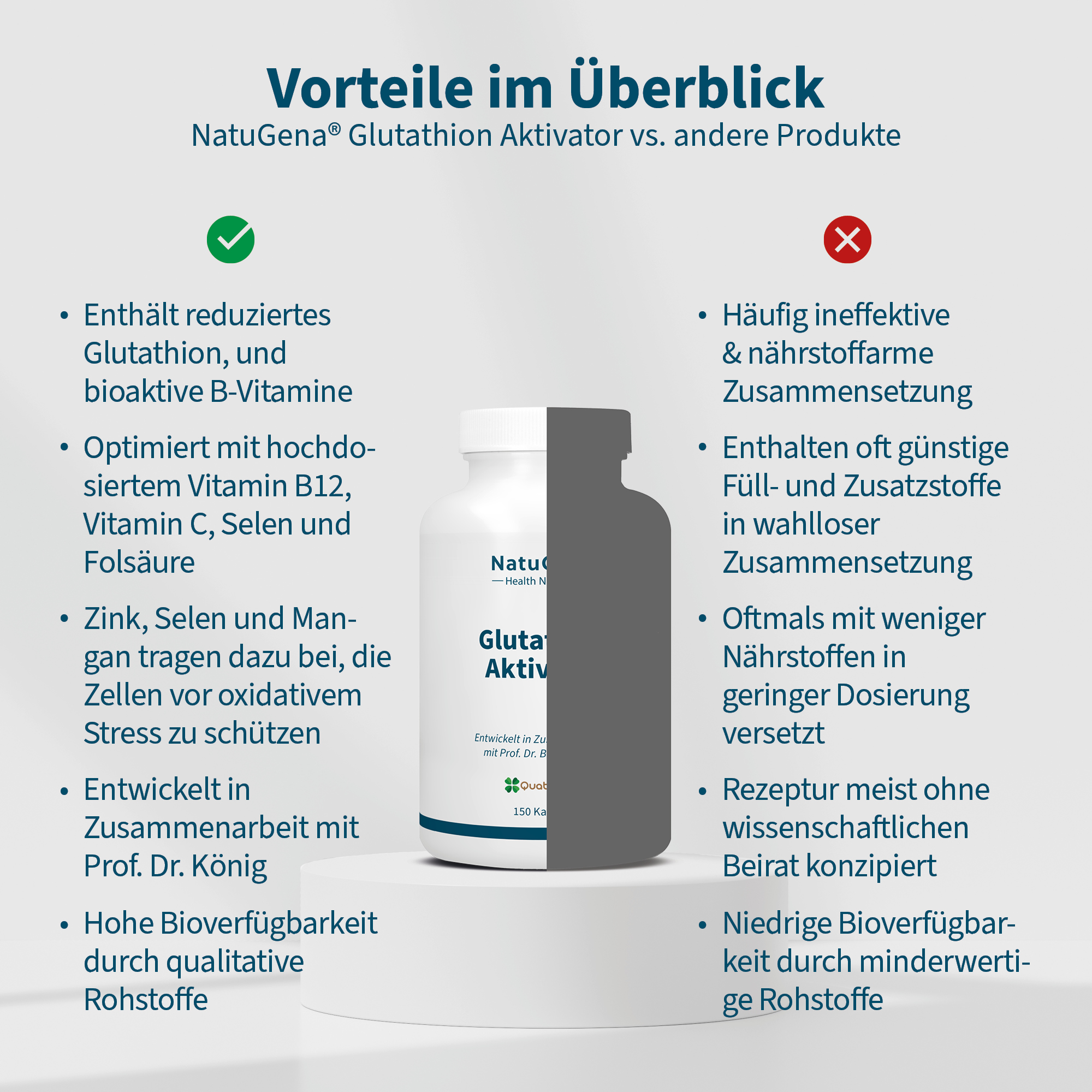 NatuGena GlutathionAktivator enthält reduziertes Glutathion in Kombination mit MSM (Methylsulfonylmethan), R-Alpha-Liponsäure und den bioaktiven B-Vitaminen B1, B2, B6, B9 und B12. Ergänzt wird die Rezeptur durch Vitamin C, Vitamin E sowie die Mineralstoffe Magnesium, Mangan, Selen und Zink.