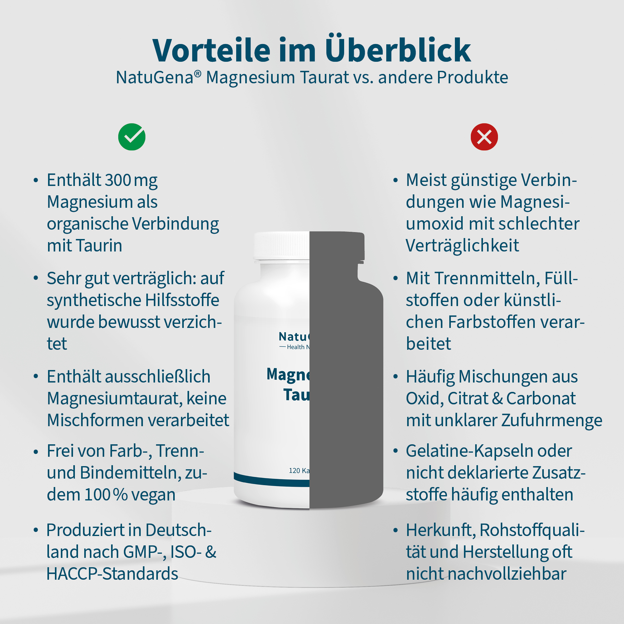NatuGena Magnesium-Taurat enthält Magnesium in einer Verbindung mit Taurin, einer natürlich vorkommenden Aminosulfonsäure. Taurin ist vor allem in Muskel- und Nervenzellen enthalten. In Magnesiumtaurat liegen Taurin und Magnesium in einer organisch gebundenen Form vor, die für ihre gute Verträglichkeit und hohe Bioverfügbarkeit bekannt ist.
