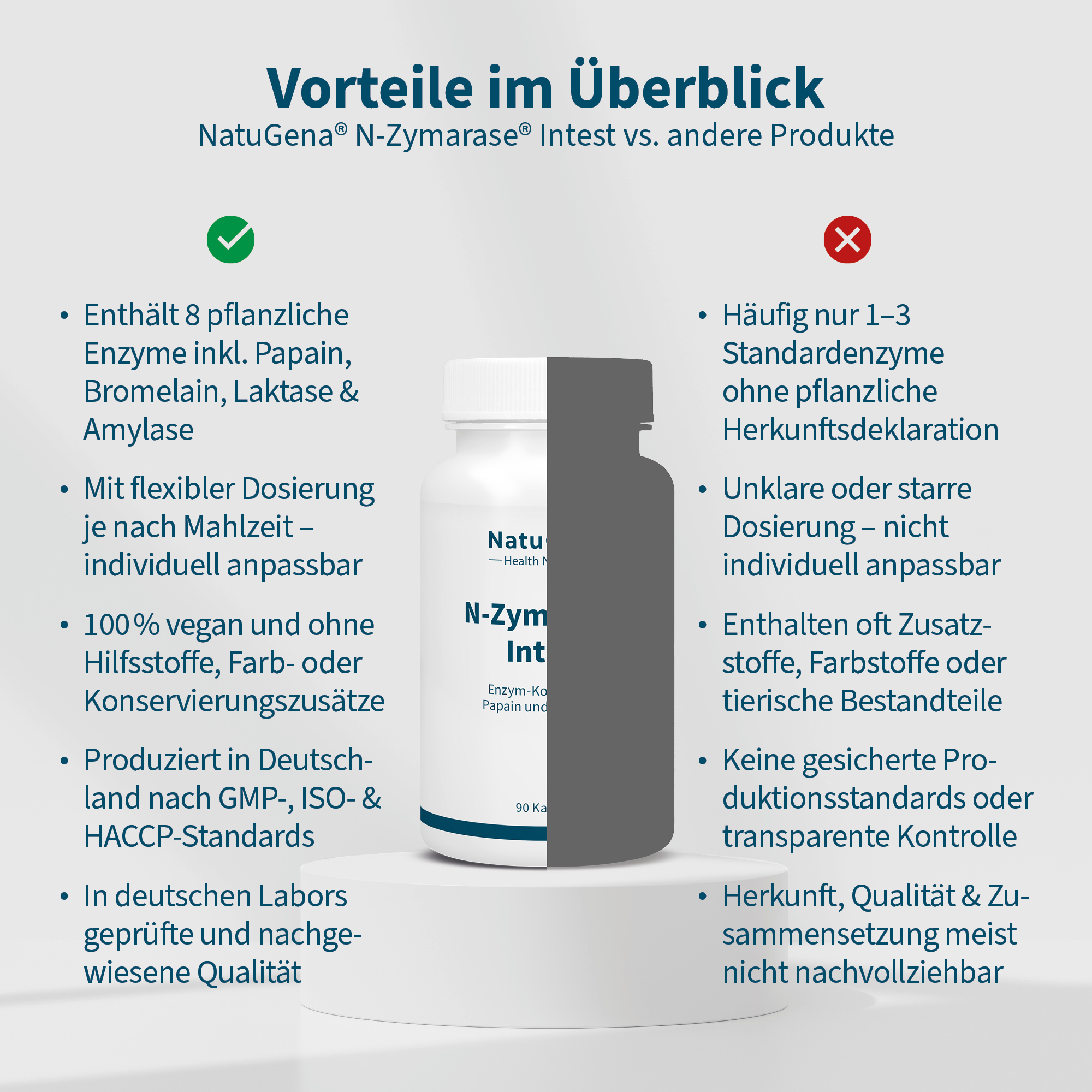 NatuGena N-Zymarase® Intest enthält eine abgestimmte Kombination aus acht unterschiedlichen Enzymen, die auf die Aufspaltung typischer Nahrungsbestandteile ausgerichtet sind. Zwei dieser Enzyme, Papain aus der Papaya und Bromelain aus der Ananas, stammen aus pflanzlicher Quelle und sind speziell auf die Spaltung von Eiweißen ausgelegt. Sie unterstützen die Zerlegung von Proteinen in kleinere Bausteine und sind in unterschiedlichen pH-Bereichen aktiv, was ihre Aktivität entlang des gesamten Verdauungstrakts begünstigt.