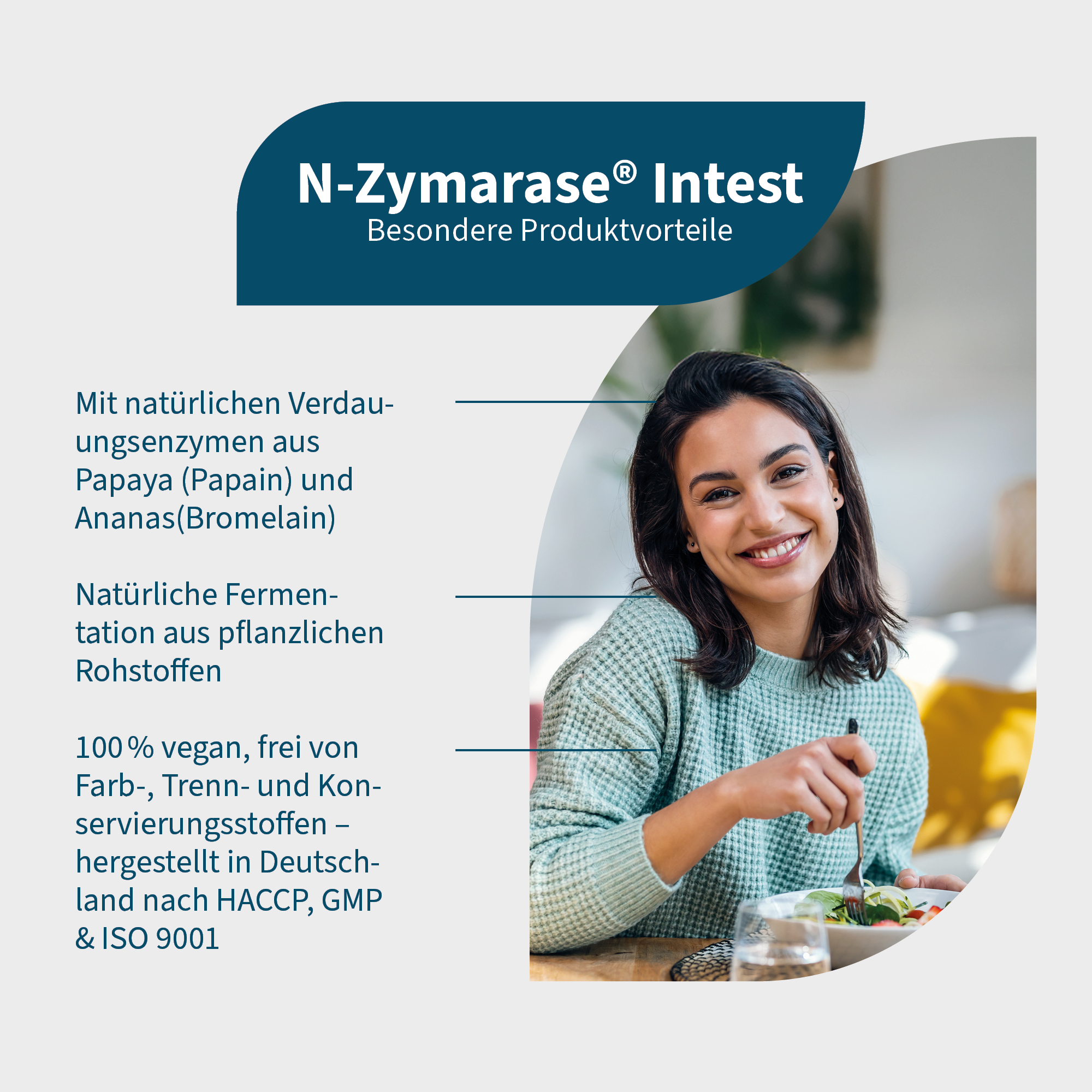 Nahrungsergänzungsmittel sollten nicht als Ersatz für eine ausgewogene und abwechslungsreiche Ernährung sowie für eine gesunde Lebensweise verwendet werden. Außerhalb der Reichweite von kleinen Kindern aufbewahren. Verschlossen, kühl, trocken und lichtgeschützt lagern. Die angegebene empfohlene tägliche Verzehrsmenge darf nicht überschritten werden. Patienten mit einer bekannten Allergie gegen Ananas und/ oder Papaya sowie Patienten mit schweren Blutgerinnungsstörungen (z. B. Bluterkrankheit) sollten N-Zymarase® Intest nicht zu sich nehmen. Dies gilt auch für Frauen in der Schwangerschaft.