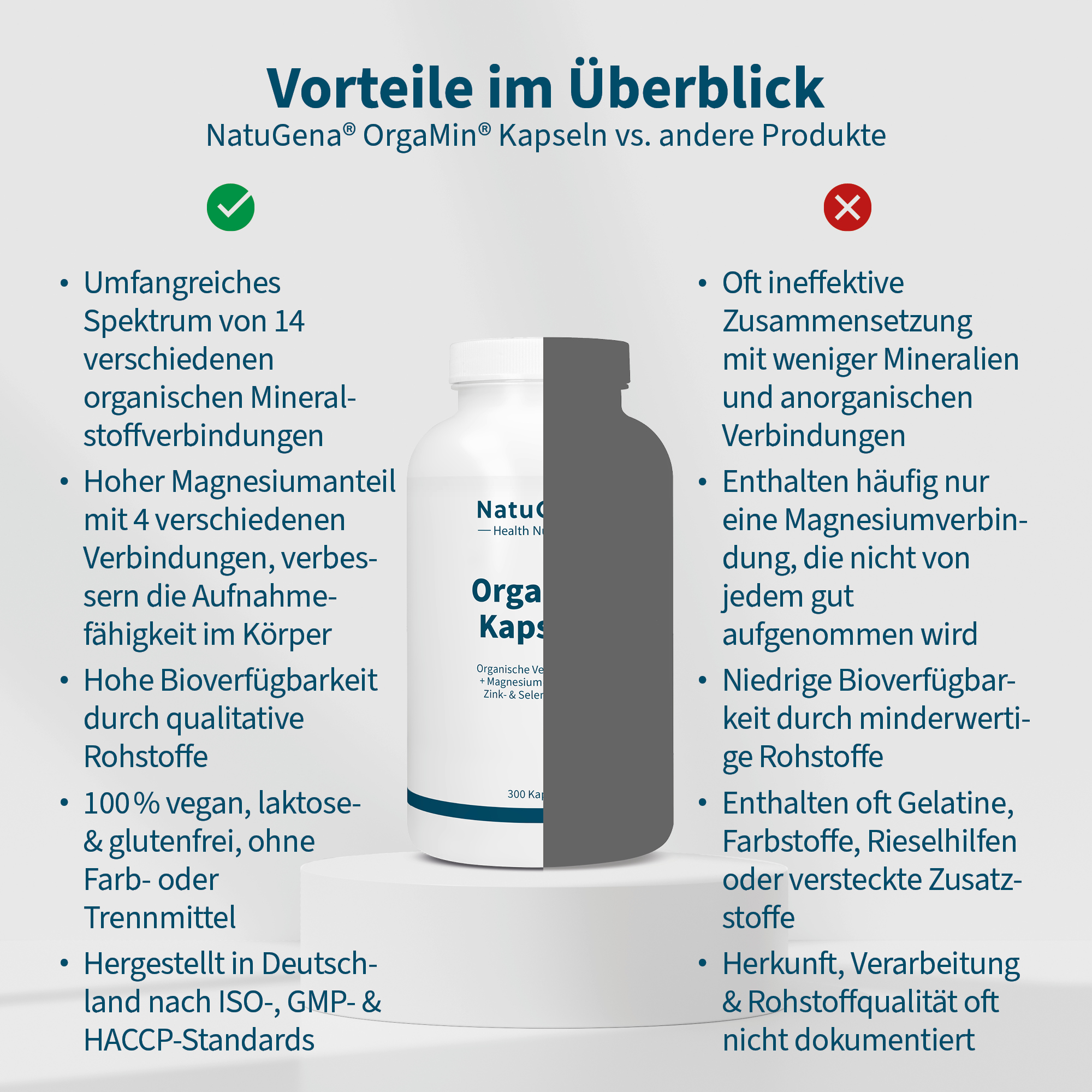 NatuGena OrgaMin® Kapseln vereint 14 essenzielle Mineralstoffe und Spurenelemente in organisch gebundener Form.