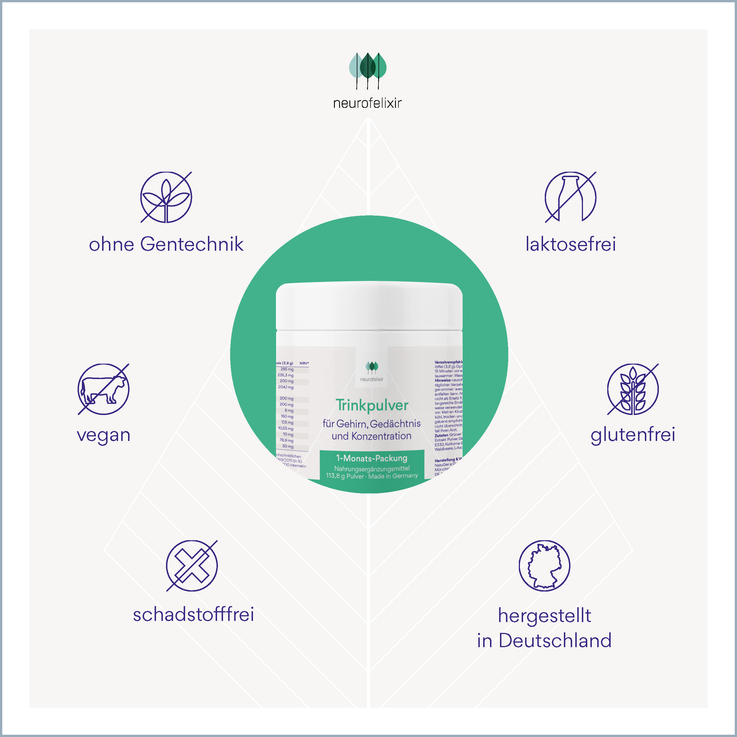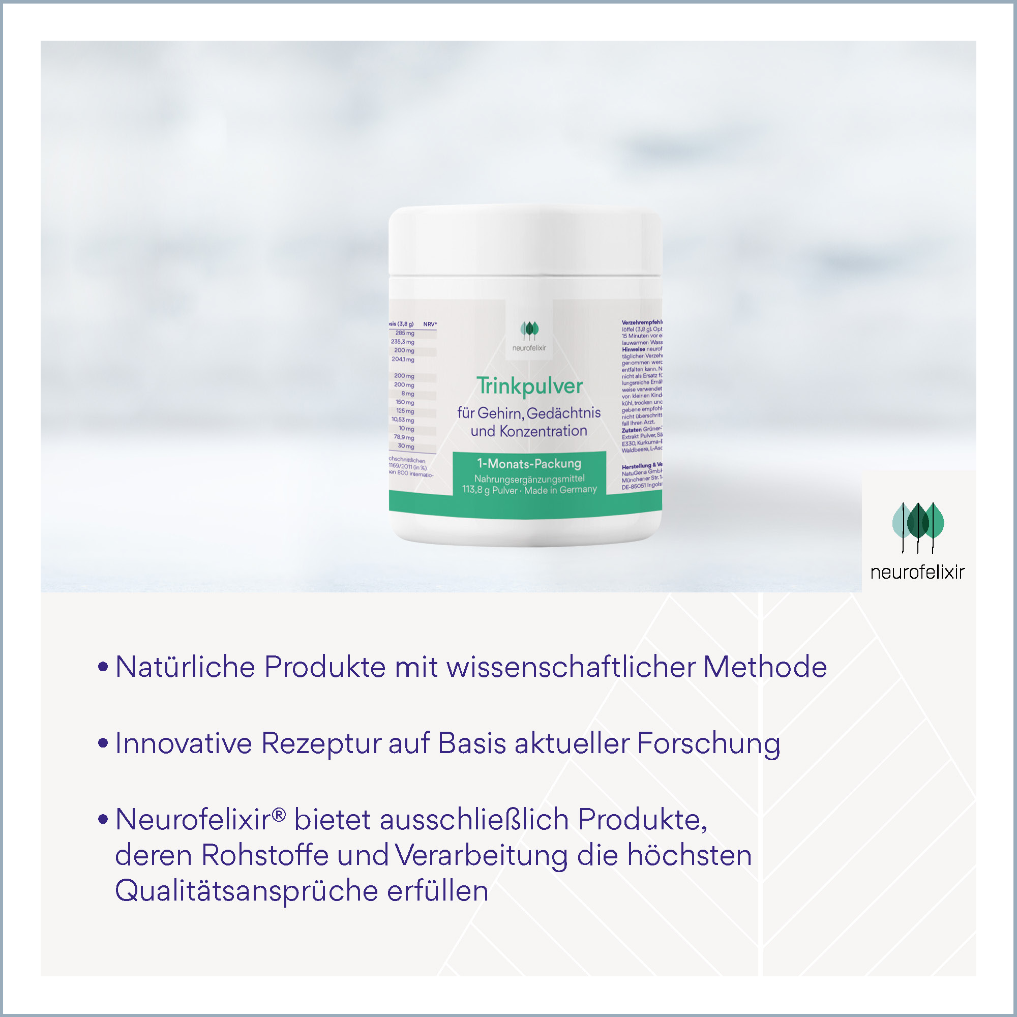 Die Zusammensetzung von neurofelixir® Trinkpulver umfasst Vitamine des B-Komplexes, Aminosäuren wie N-Acetyl-L-Cystein und Taurin sowie pflanzliche Polyphenole. Ergänzt wird die Formel durch weitere bioaktive Verbindungen wie Pterostilben, Quercetin und Coenzym Q10.