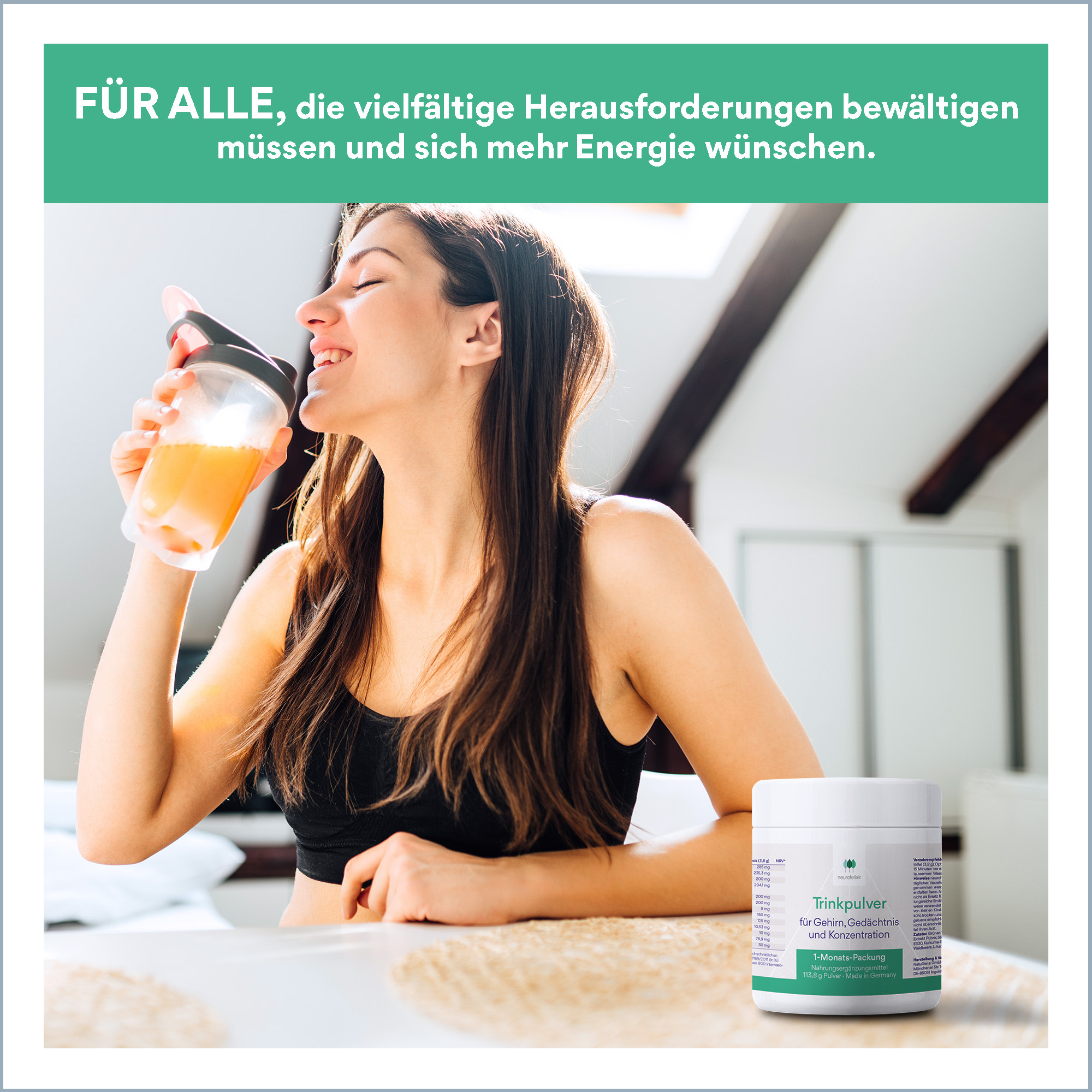 Jeder Tag verläuft anders und bringt vielfältige Aufgaben mit sich, ob im Beruf, im Alltag oder unterwegs. In vielen Momenten spielen Aufmerksamkeit und mentale Präsenz eine natürliche Rolle. neurofelixir® Trinkpulver verbindet Vitamine, Aminosäuren und pflanzliche Inhaltsstoffe zu einer ausgewogenen Mikronährstoffformel.