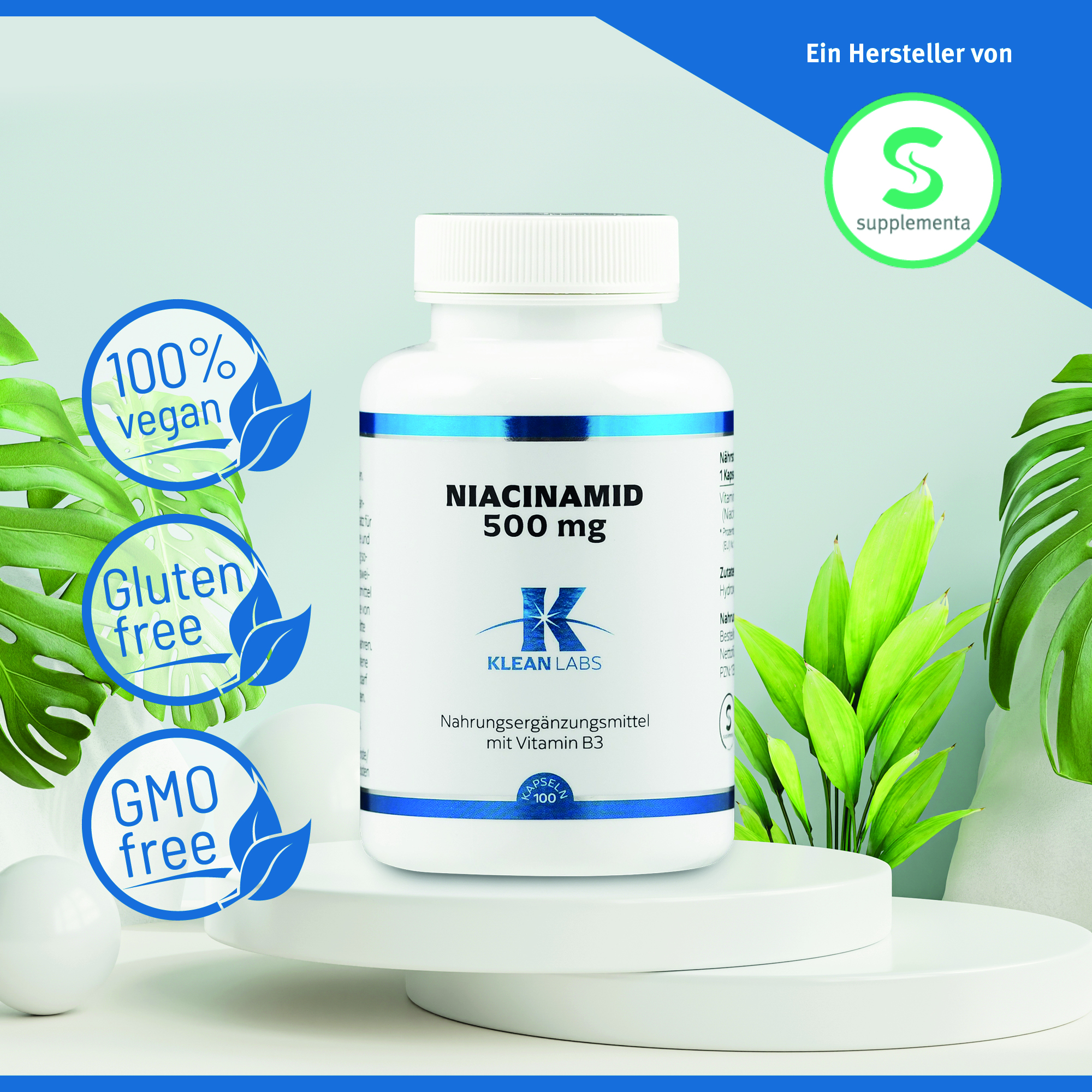 Niacinamid (B3) 500 mg von Klean Labs ist ein hochwertiges Nahrungsergänzungsmittel, welches 500 mg Vitamin B3 pro Kapsel enthält.