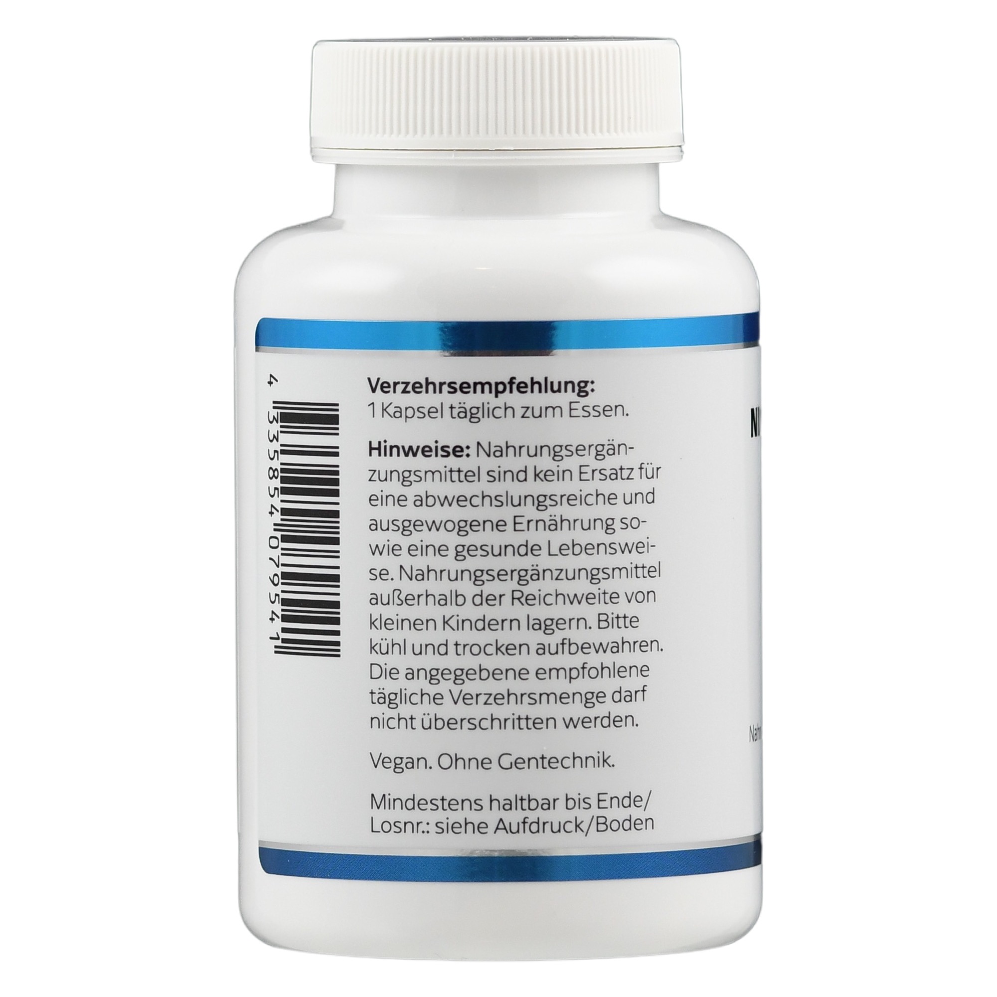 Kapsel. Das Produkt ist vegan und ohne Gentechnik. Es enthält 100