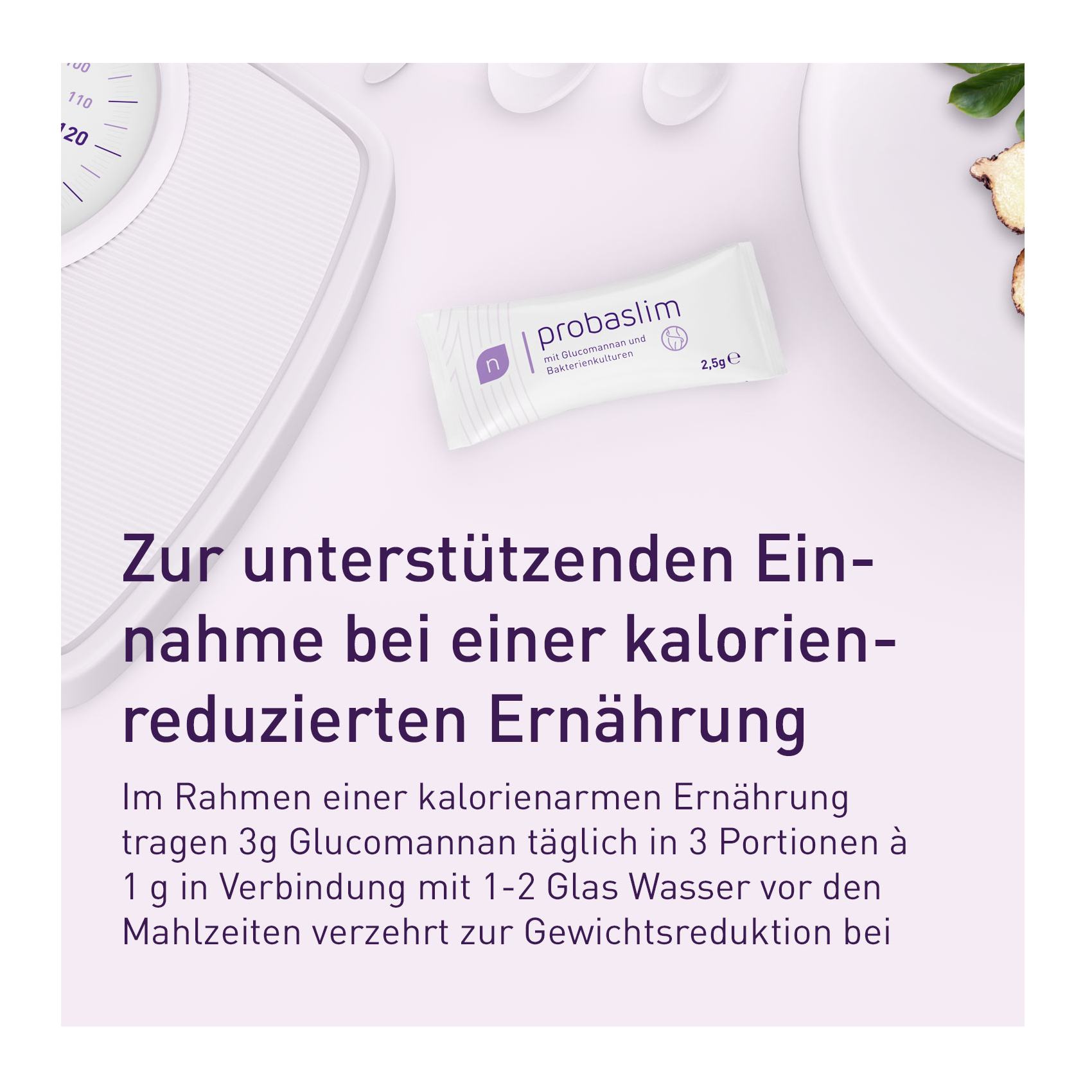 Glucomannan ist ein rein pflanzlicher Ballaststoff, der aus der Konjakwurzel gewonnen wird. Er kann ein Vielfaches seines Eigengewichtes an Wasser aufnehmen. Im Magen quillt Glucomannan daher auf und kann so das Sättigungsgefühl verbessern und zu einer geringeren Kalorienaufnahme beitragen. Glucomannan trägt im Rahmen einer kalorienarmen Ernährung so zu Gewichtsverlust bei.