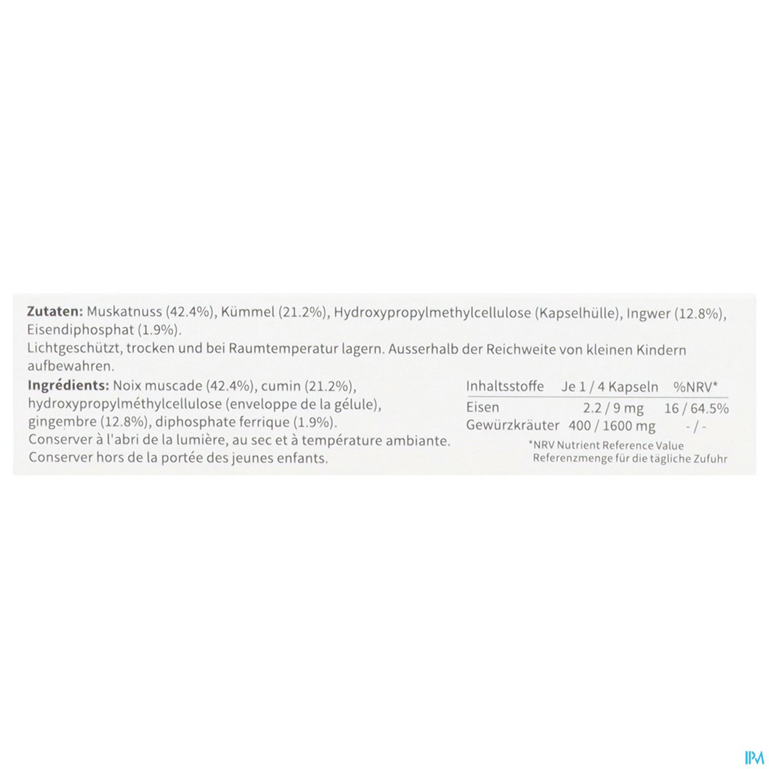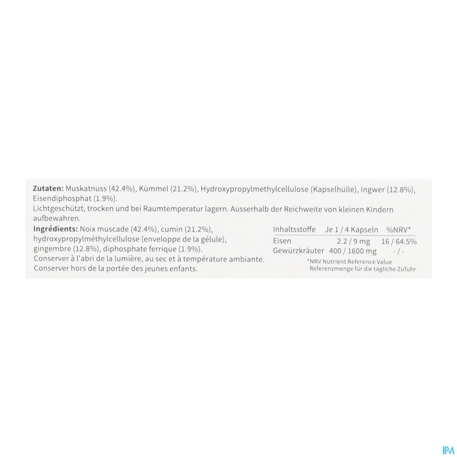 Kräuterkapseln mit naturbelassenem Muskat, Kümmel, Ingwer und Eisen. Eisen trägt: