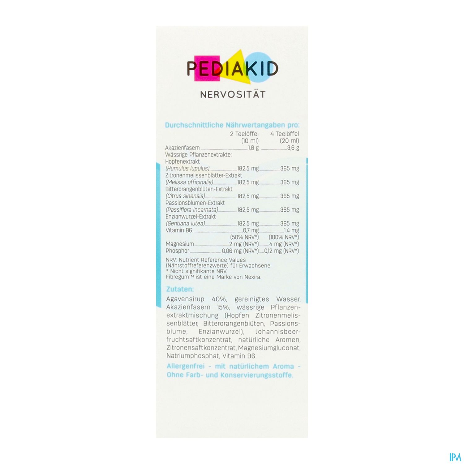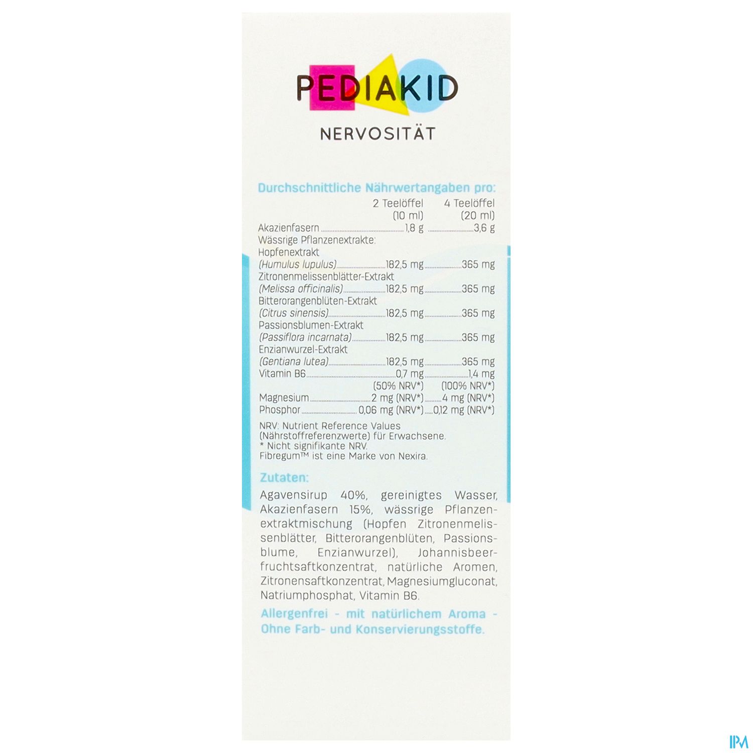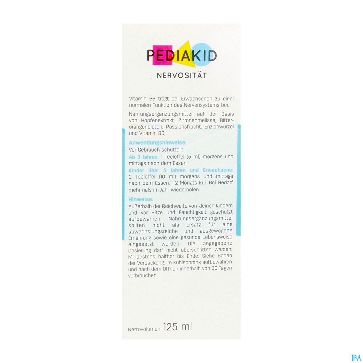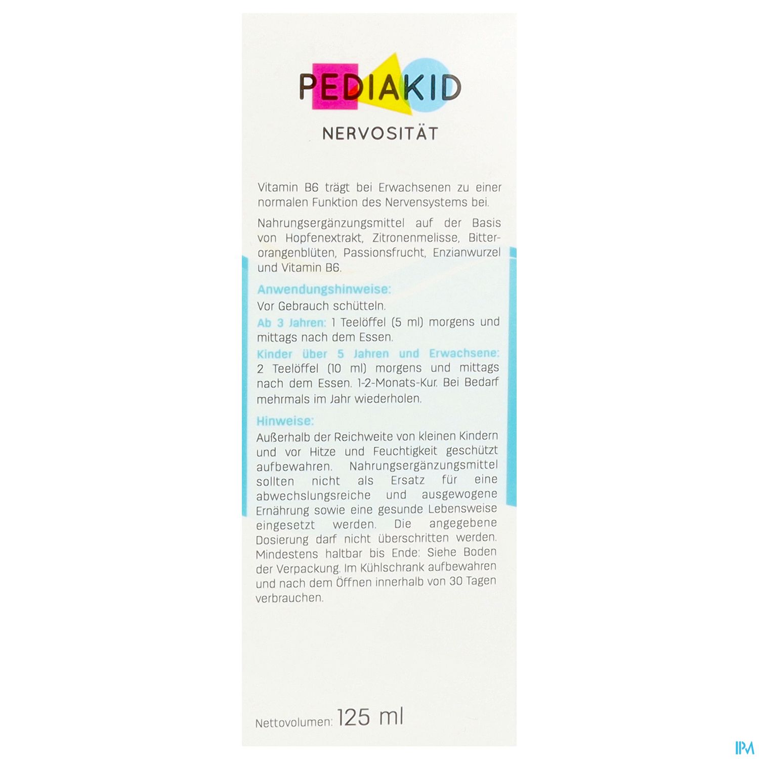 PEDIAKID® Nervosität ist eine natürliche und effiziente Kombination von Inhaltsstoffen (Passionsblume, Hopfen, Orangenblüte) zur Besänftigung innerer Unruhe und kleiner Gefühlsschwankungen von Kindern, wie schlechte Laune und Nervosität, die durch den hektischen Rhythmus des modernen Lebens entstehen können. Vitamin B6 leistet einen Beitrag zur Funktion des Nervensystems. Angenehmes Aroma aus natürlichem Konzentrat der schwarzen Johannisbeere.