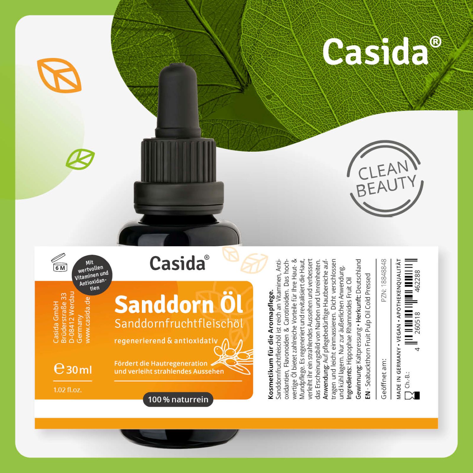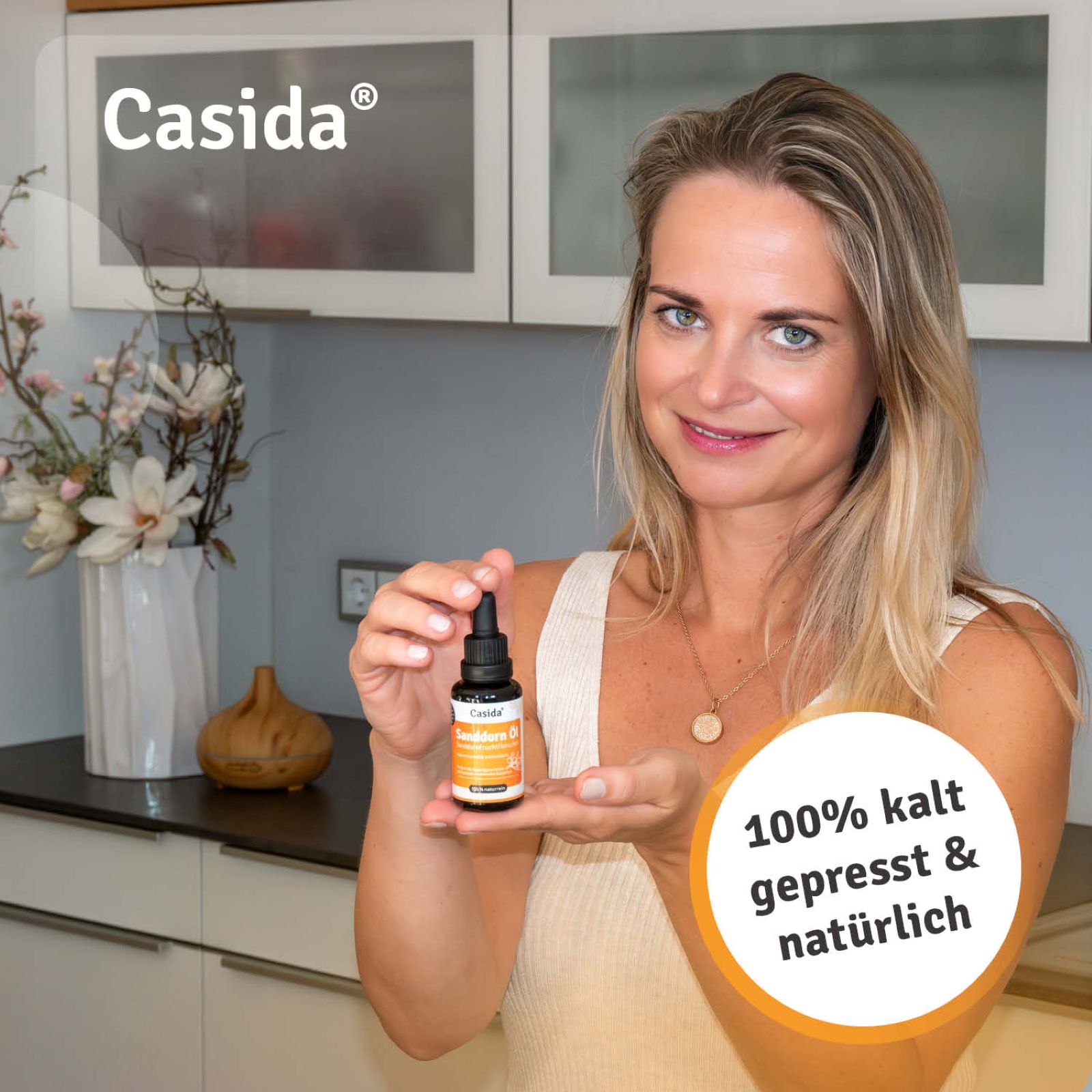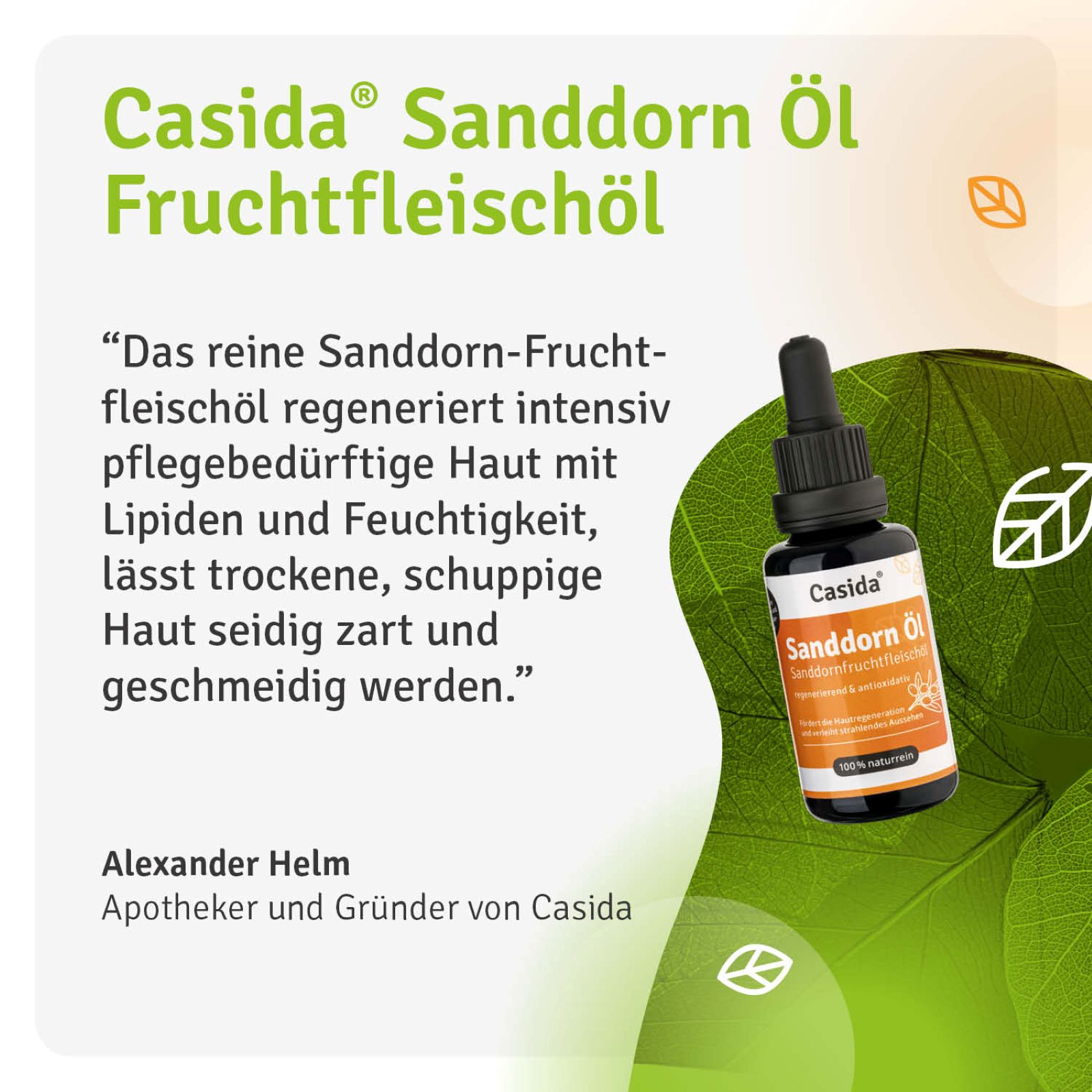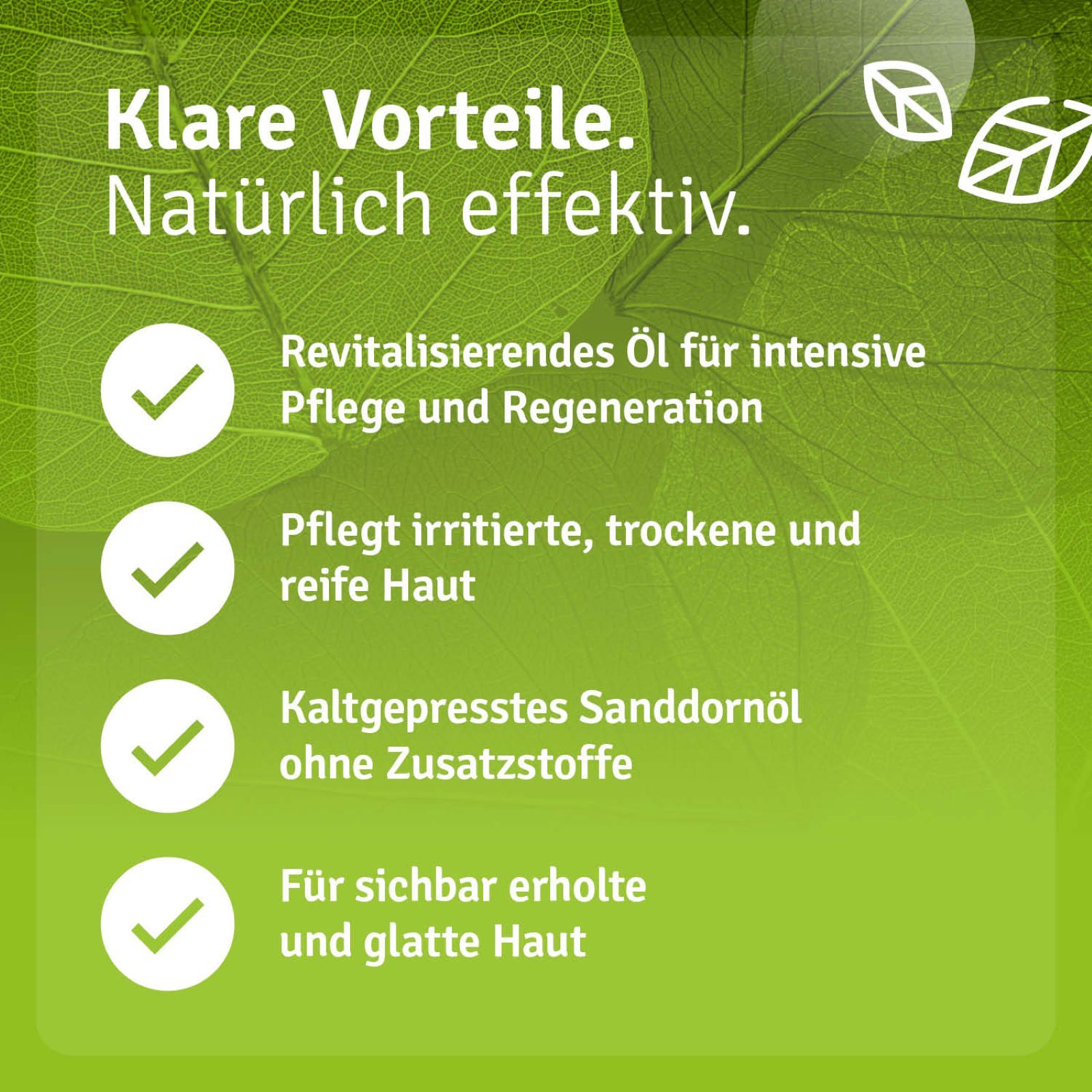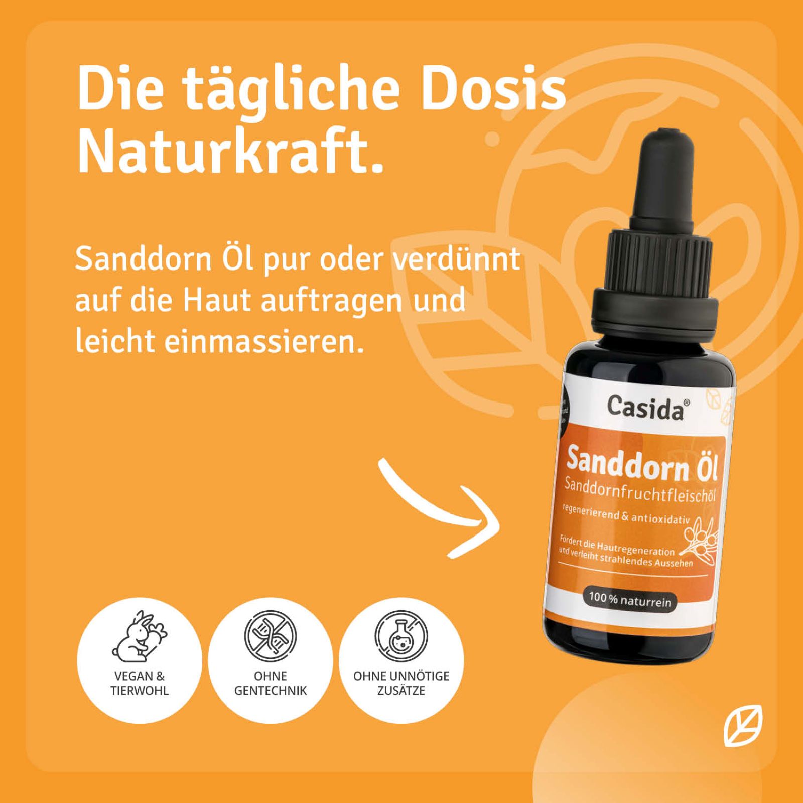 Sanddornöl ist ein wunderbares Hautöl für die tägliche Gesichts- und Körperpflege. Es glättet die Haut spürbar, lässt sie vitaler erscheinen und verbessert das Erscheinungsbild von Narben und Unreinheiten. Sanddornöl enthält zahlreiche wertvolle Inhaltsstoffe. Vitamin C ist an der Kollagen-Synthese beteiligt. Vitamin E schützt die Zellen vor oxidativem Stress. Antioxidantien, Flavonoide, Carotinoide und ungesättigte Fettsäuren verleihen der Haut ein strahlendes Aussehen.