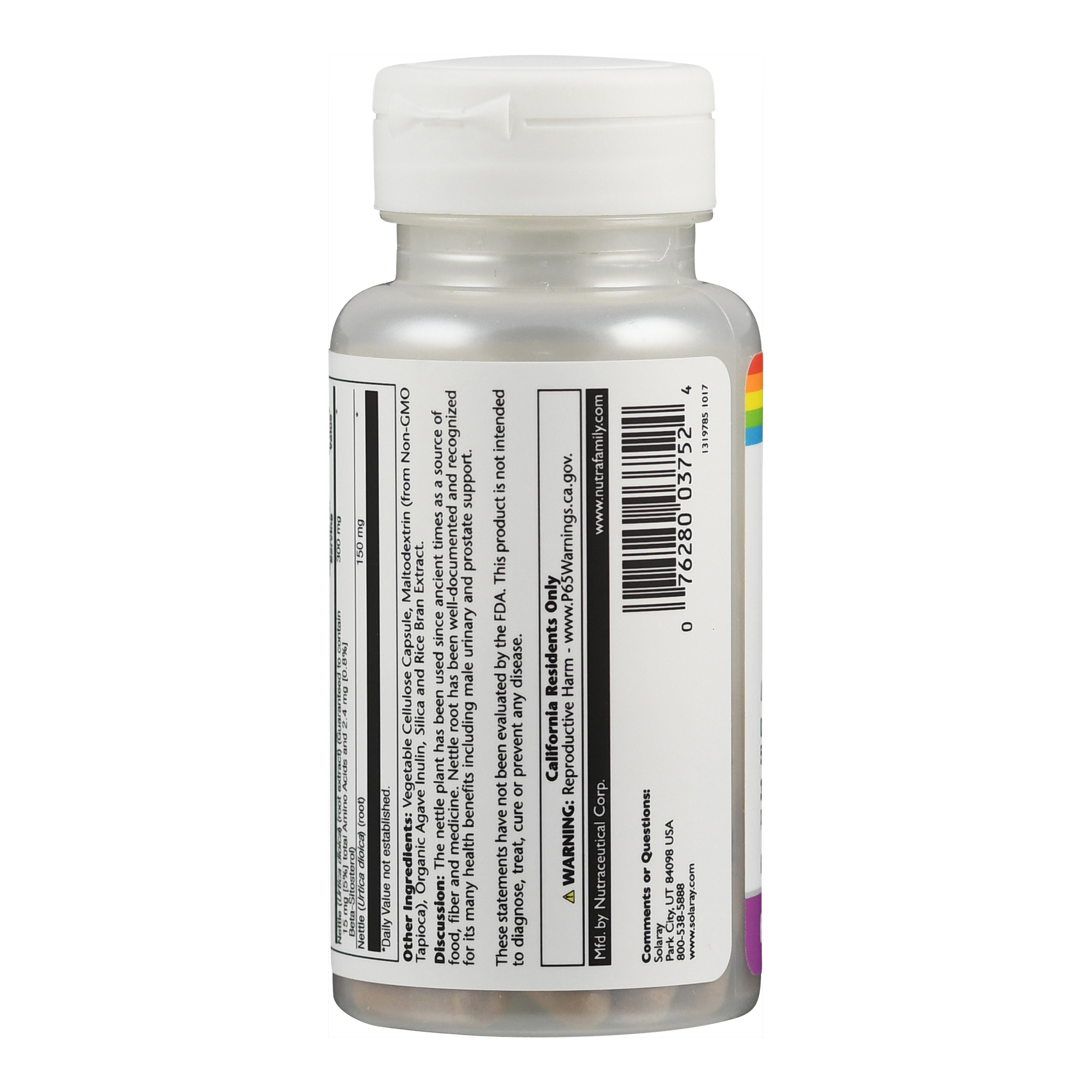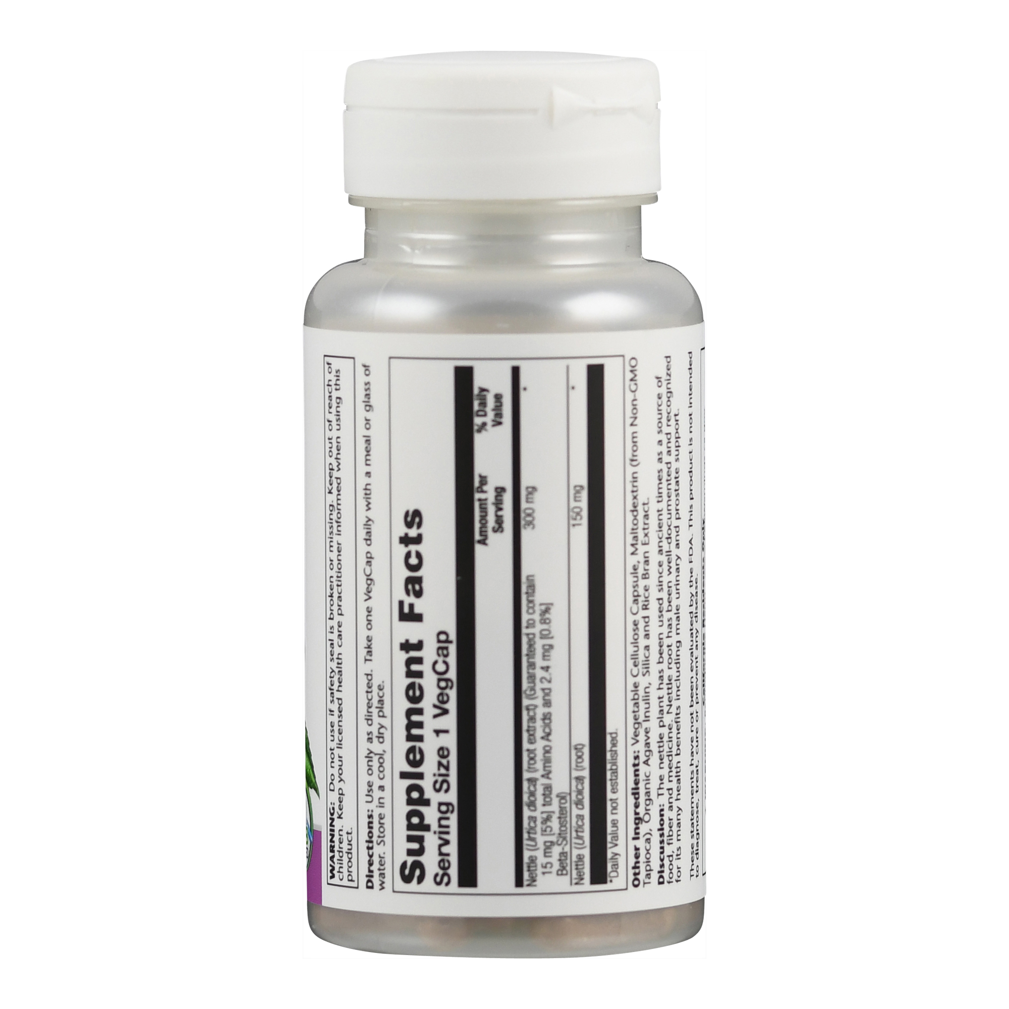 Brennnesselwurzel von Solaray liefert 150 mg Wurzel und 300 mg Wurzelextrakt pro Kapsel. Der Wurzelextrakt besitzt einen garantierten Gehalt von 0,8 % Beta-Sitosterol und 5 % Aminosäuren.