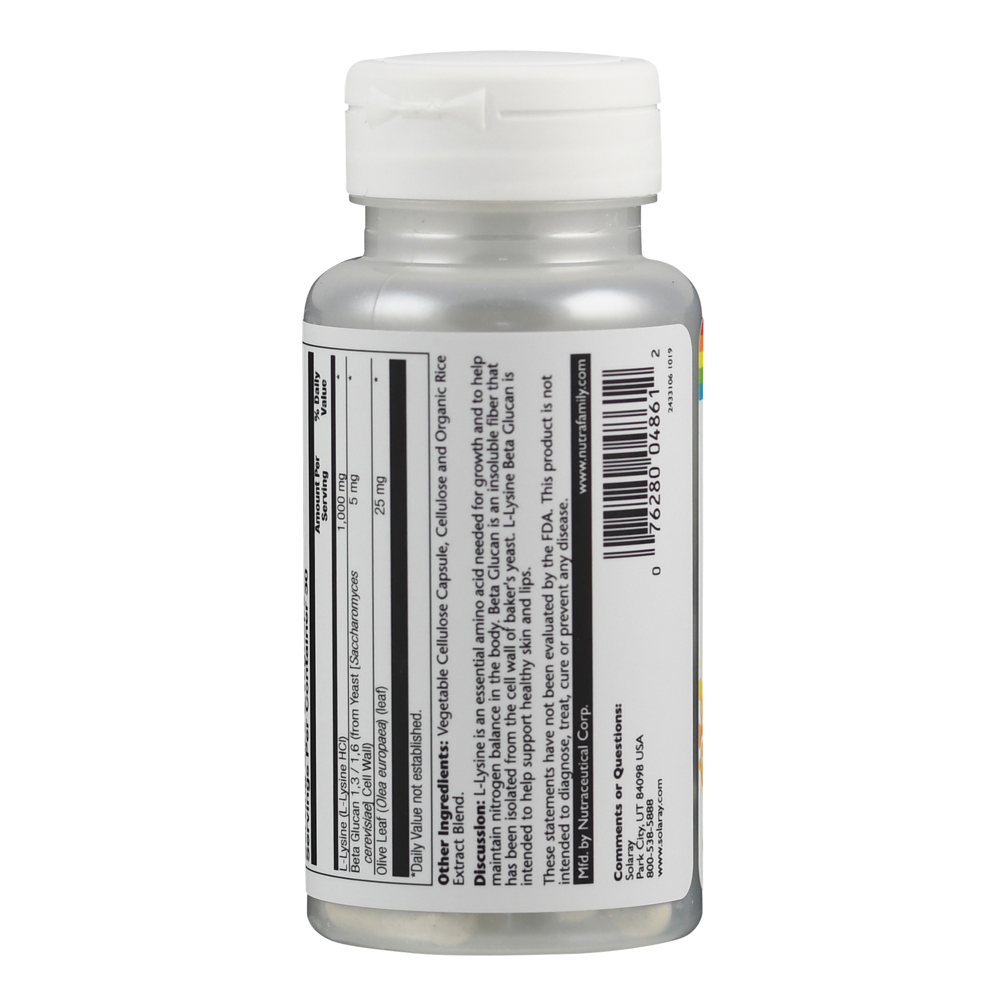 L-Lysin-HCl, Kapselhülle Cellulose (pflanzlich), Füllstoff Cellulose, Reisextraktmischung, Olivenblätter, Beta-Glucan (aus Hefe (Saccharomyces cerevisiae))