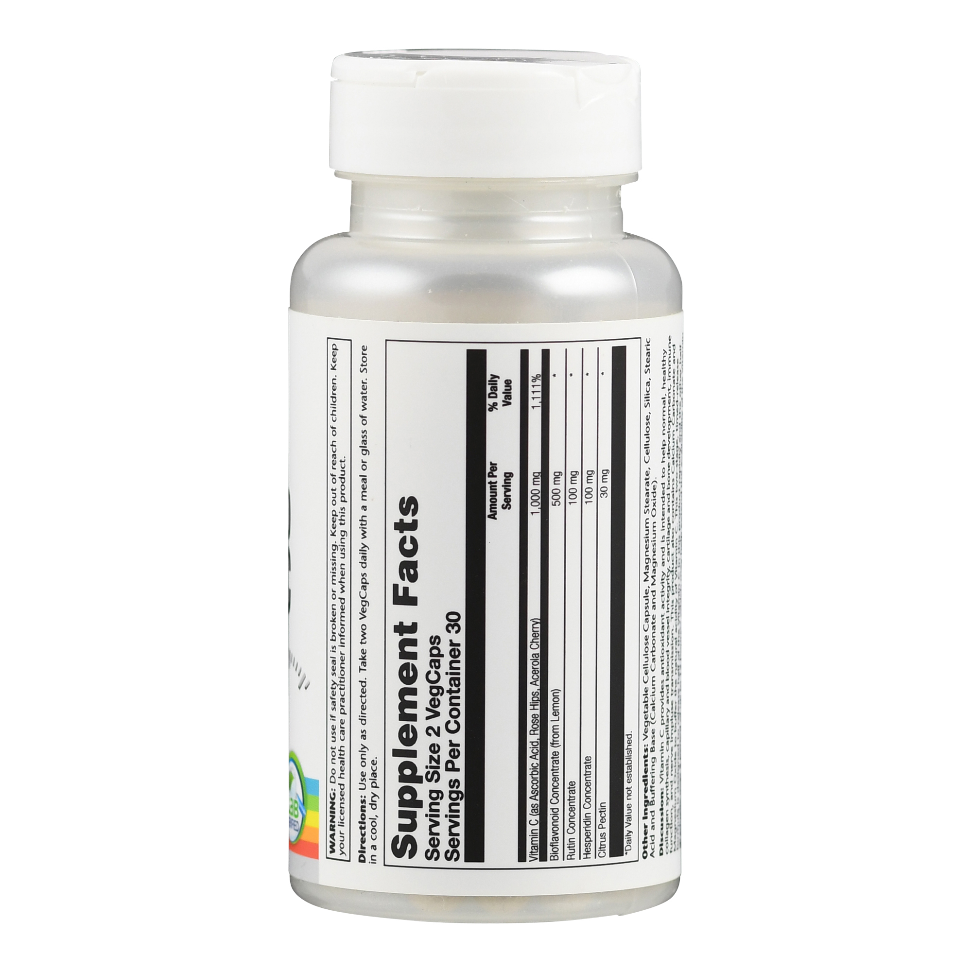 Vitamin C (Ascorbinsäure, Hagebutte, Acerolakirsche), Bioflavonoid-Konzentrat, Kapselhülle Cellulose (pflanzlich), Rutin-Konzentrat, Hesperidin-Konzentrat, Trennmittel Magnesiumsalze der Speisefettsäuren, Citruspektin, Trennmittel Cellulose, Trennmittel Siliciumdioxid, Trennmittel Speisefettsäuren, Pufferbasis (Calciumcarbonat, Magnesiumoxid)