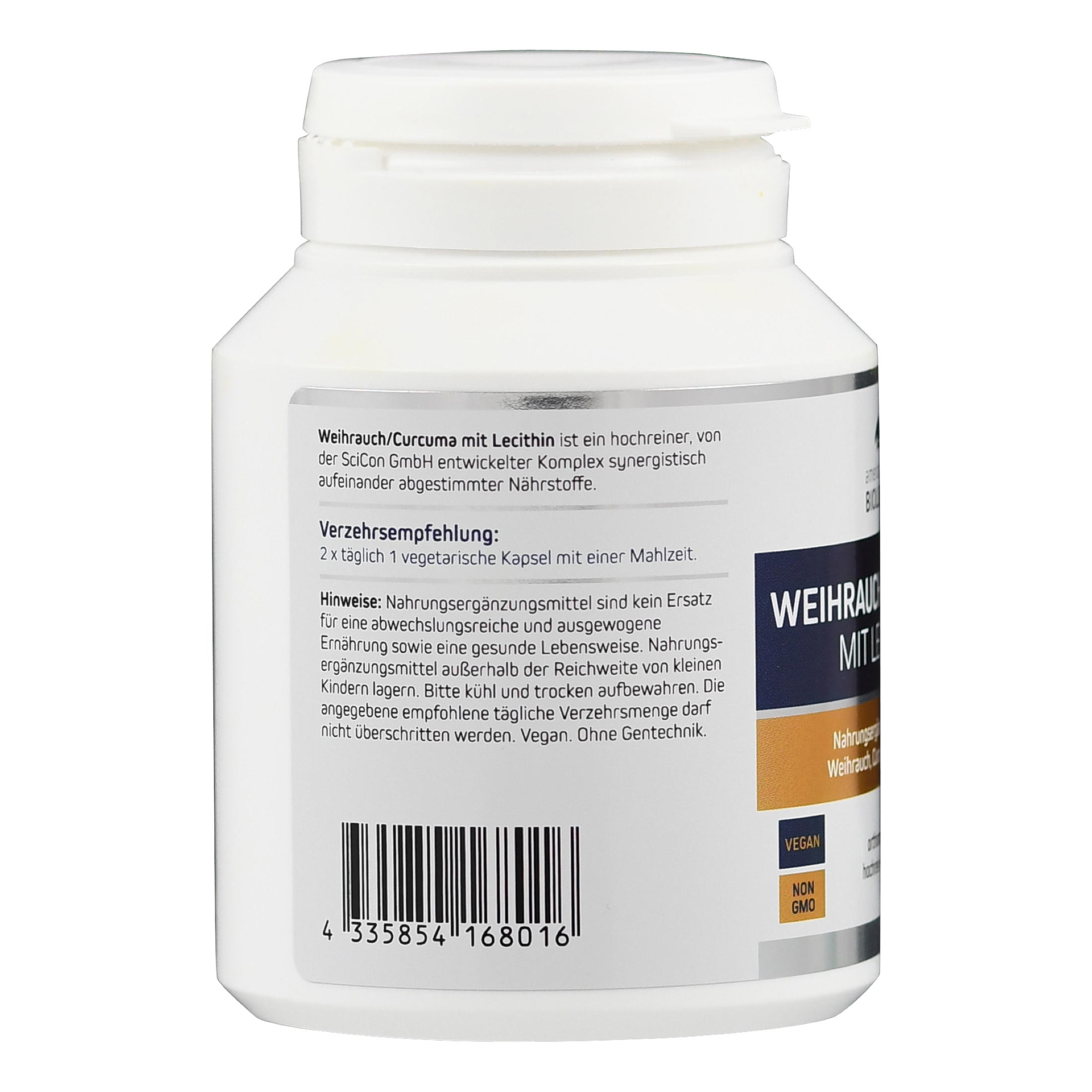 Weihrauch/Curcuma mit Lecithin ist eine Mischung aus 400 mg Weihrauch, 200 mg Kurkuma und 400 mg Sonnenblumen-Lecithin pro Tagesverzehrsempfehlung von 2 Kapseln.