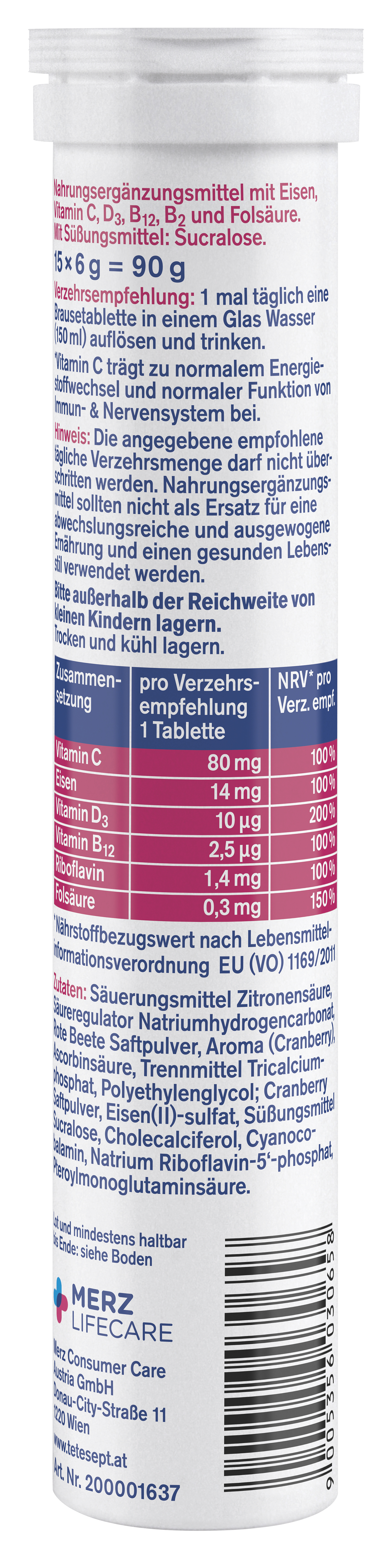 Ingredients: Zutaten: Säuerungsmittel Zitronensäure, Säureregulator Natriumhydrogencarbonat, Rote Beete Saftpulver, Aroma (Cranberry), Ascorbinsäure, Trennmittel Tricalciumphosphat, Polyethylenglycol; Cranberry Saftpulver, Eisen(II)-sulfat, Süßungsmittel Sucralose, Cholecalciferol, Cyanocobalamin, Natrium Riboflavin-5‘-phosphat, Pteroylmonoglutaminsäure