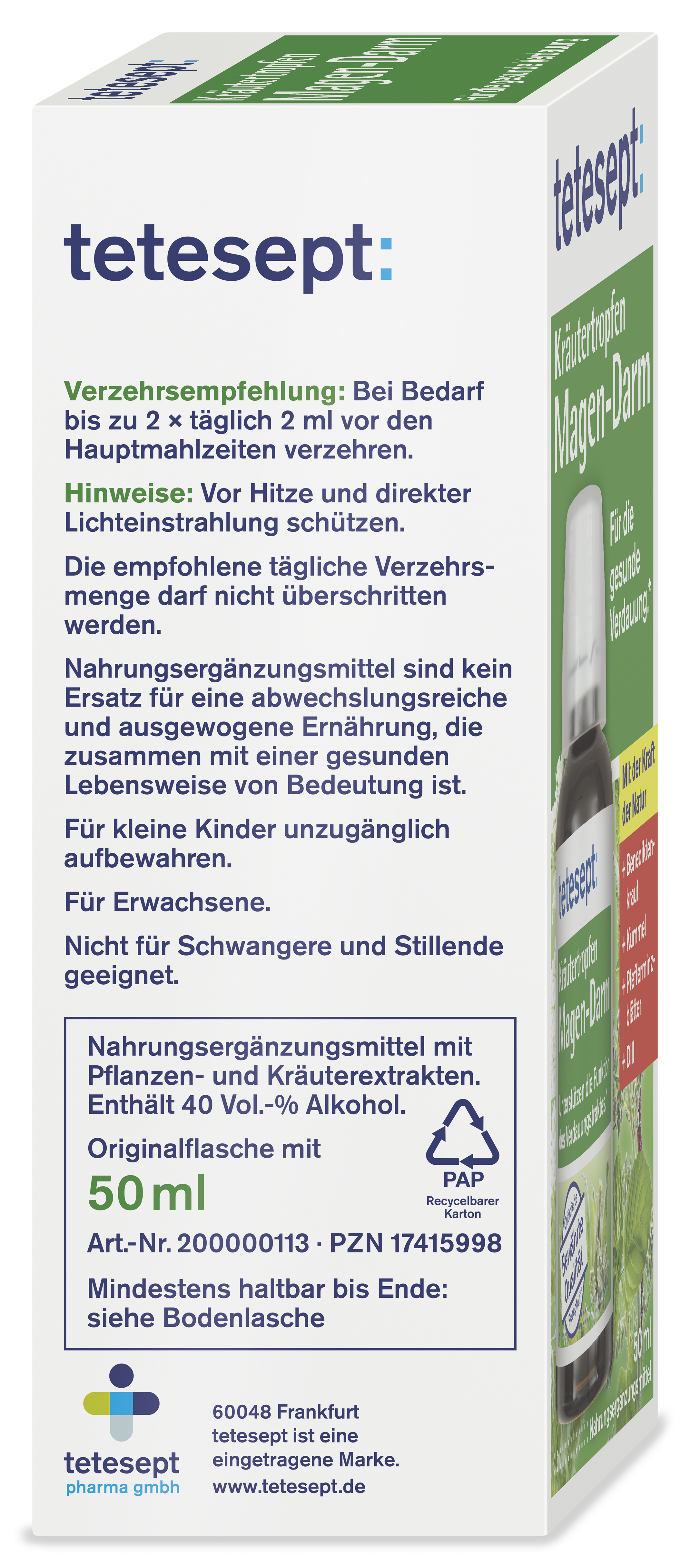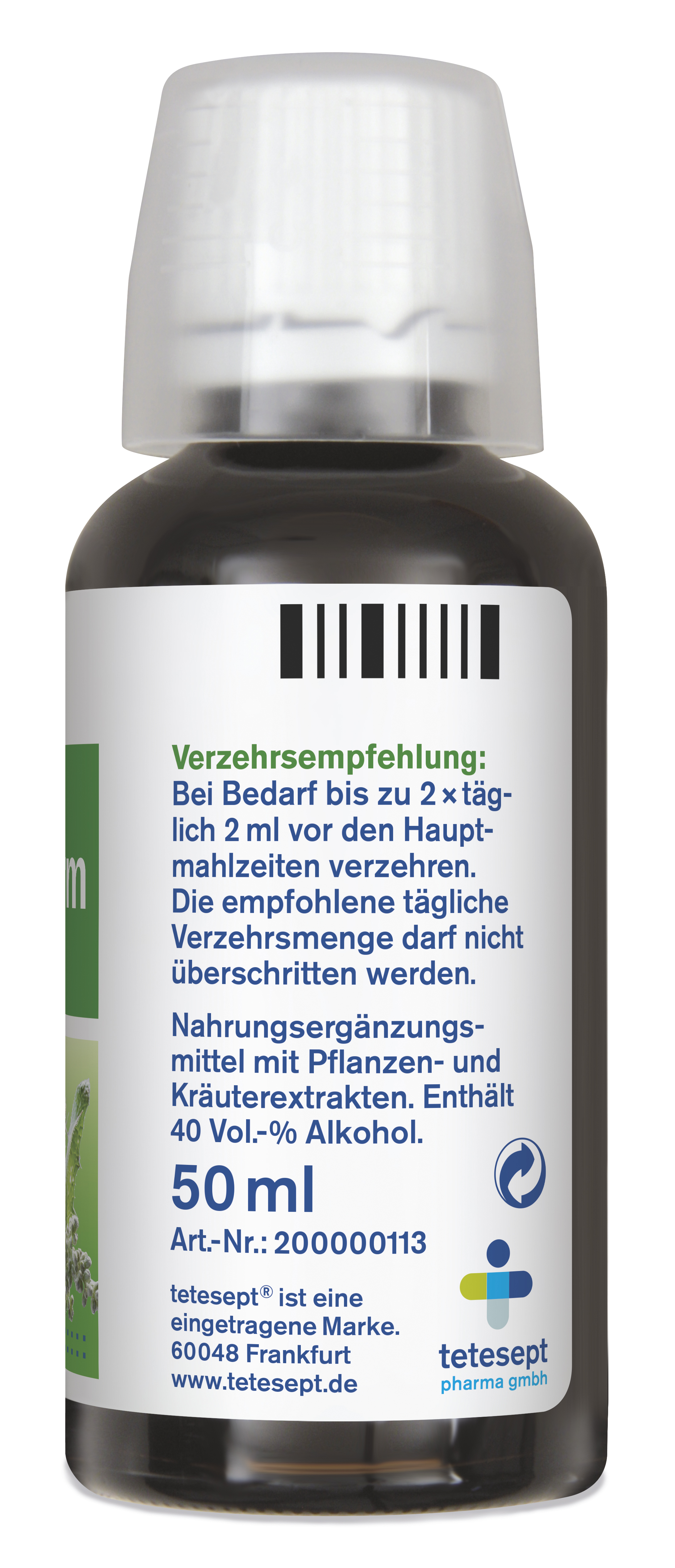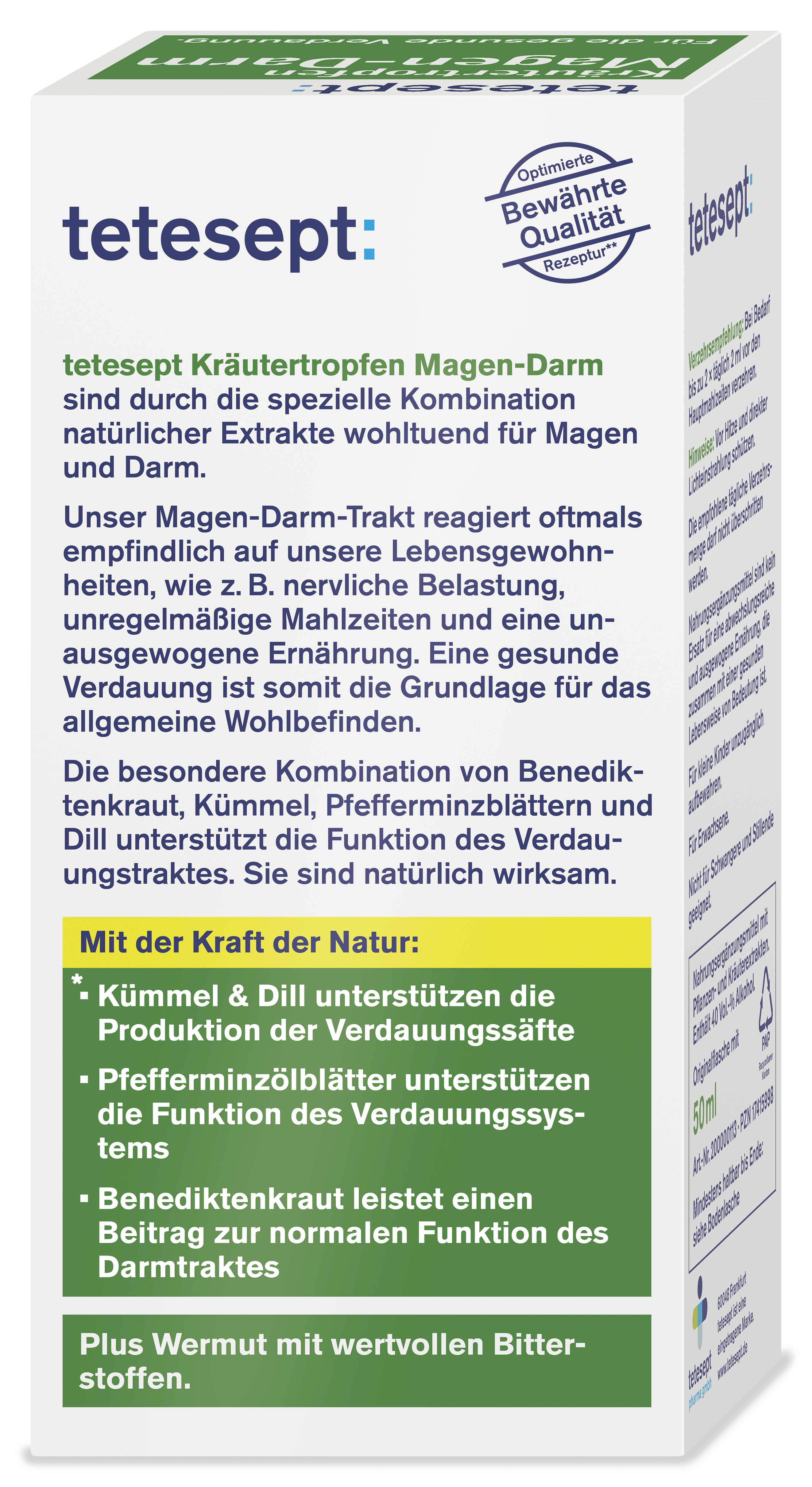 Ingredients: Ethanolische Extrakte aus Wermutkraut, Pfefferminzblättern, Dillfrüchten, Benediktenkraut und Kümmelfrüchten.