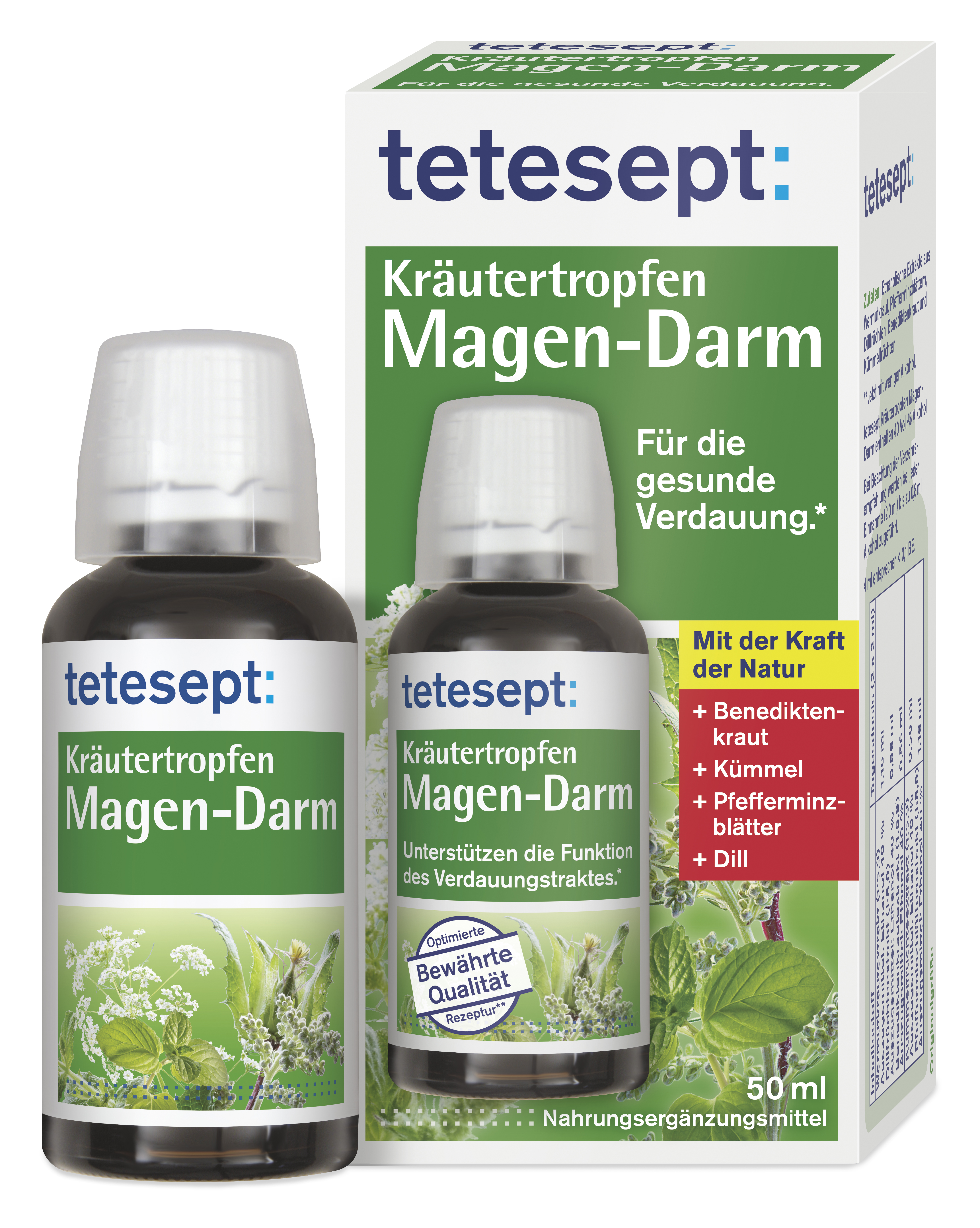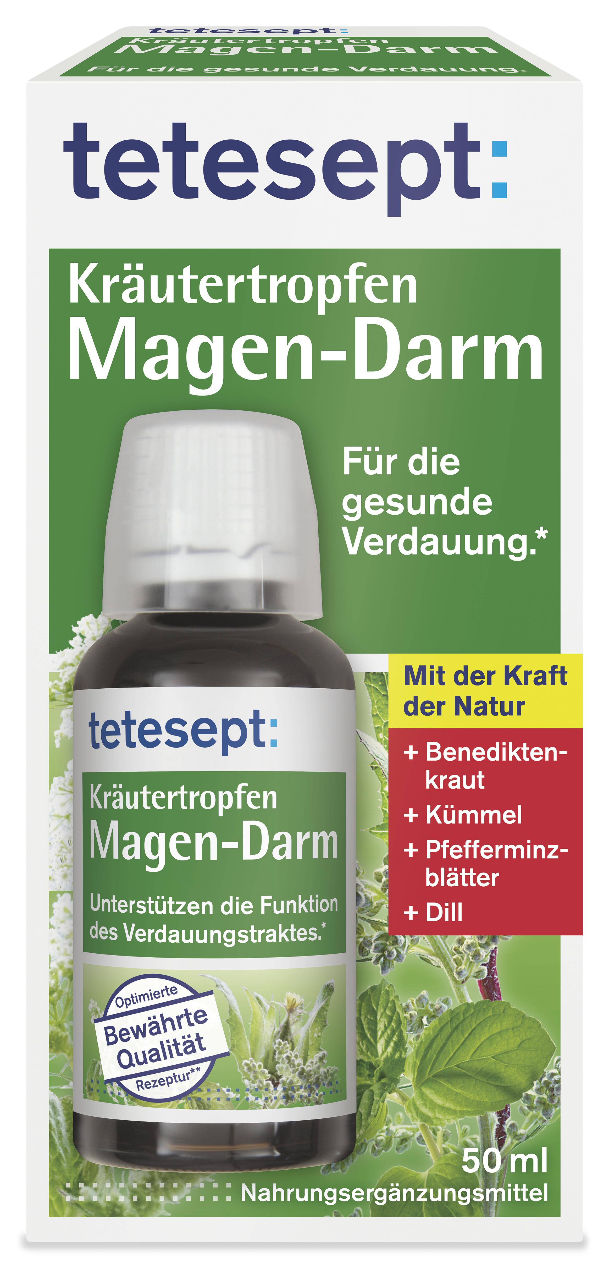 tetesept Kräutertropfen Magen-Darm sind durch die spezielle Kombination natürlicher Extrakte wohltuend für Magen und Darm. Unser Magen-Darm-Trakt reagiert oftmals empfindlich auf unsere Lebensgewohnheiten, wie z. B. nervliche Belastung, unregelmäßige Mahlzeiten und eine unausgewogene Ernährung. Eine gesunde Verdauung ist somit die Grundlage für das allgemeine Wohlbefinden. Die besondere Kombination von Benediktenkraut, Kümmel, Pfefferminzblättern und Dill unterstützt die Funktion des Verdauungstraktes. Sie sind natürlich wirksam.