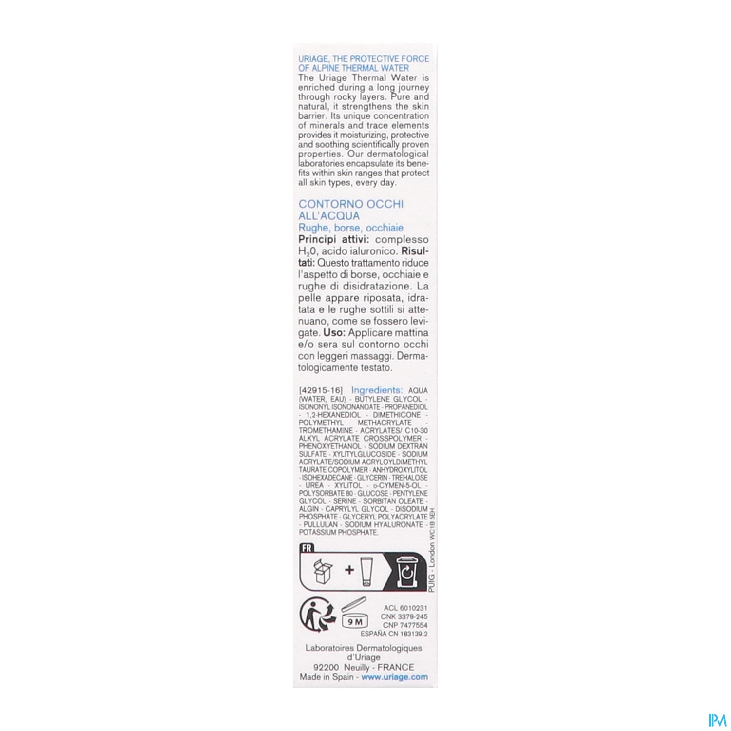 AQUA/Eau Uriage — BUTYLENE GLYCOL — ISONONYL ISONONANOATE — PROPANEDIOL — 1,2-HEXANEDIOL — DIMETHICONE — POLYMETHYL METHACRYLATE — TROMETHAMINE — ACRYLATES/C10-30 ALKYL ACRYLATE CROSSPOLYMER — PHENOXYETHANOL — SODIUM DEXTRAN SULFATE — XYLITYLGLUCOSIDE — SODIUM ACRYLATE/SODIUM ACRYLOYLDIMETHYL TAURATE COPOLYMER — ANHYDROXYLITOL — ISOHEXADECANE — GLYCERIN — TREHALOSE — UREA — XYLITOL — o-CYMEN-5-OL — POLYSORBATE 80 — GLUCOSE — PENTYLENE GLYCOL — SERINE — SORBITAN OLEATE — ALGIN — CAPRYLYL GLYCOL — DISODIUM PHOSPHATE — GLYCERYL POLYACRYLATE — PULLULAN — SODIUM HYALURONATE — POTASSIUM PHOSPHATE