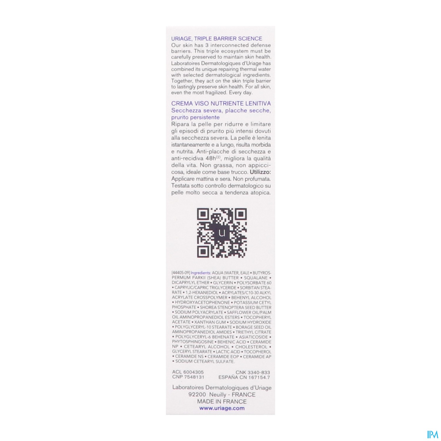 AQUA/Eau Uriage — BUTYROSPERMUM PARKII BUTTER — HYDROGENATED POLYDECENE — GLYCERIN — CETEARYL ISONONANOATE — ISODECYL NEOPENTANOATE — PROPYLHEPTYL CAPRYLATE — BUTYLENE GLYCOL — PTFE — STEARETH-2 — STEARETH-21 — TAPIOCA STARCH — PENTAERYTHRITYL DISTEARATE — CETYL ALCOHOL — DIMETHICONE — CERA MICROCRISTALLINA (MICROCRYSTALLINE WAX) — SODIUM POLYACRYLATE — BRASSICA CAMPESTRIS STEROLS — TOCOPHERYL ACETATE — CHLORPHENESIN — o-CYMEN-5-OL — PIROCTONE OLAMINE — XANTHAN GUM — RASPBERRY SEED OIL/PALM OIL AMINOPROPANEDIOL ESTERS — POLYMETHYLSILSESQUIOXANE — ASIATICOSIDE — PHYTOSPHINGOSINE — BORAGE SEED OIL AMINOPROPANEDIOL AMIDES