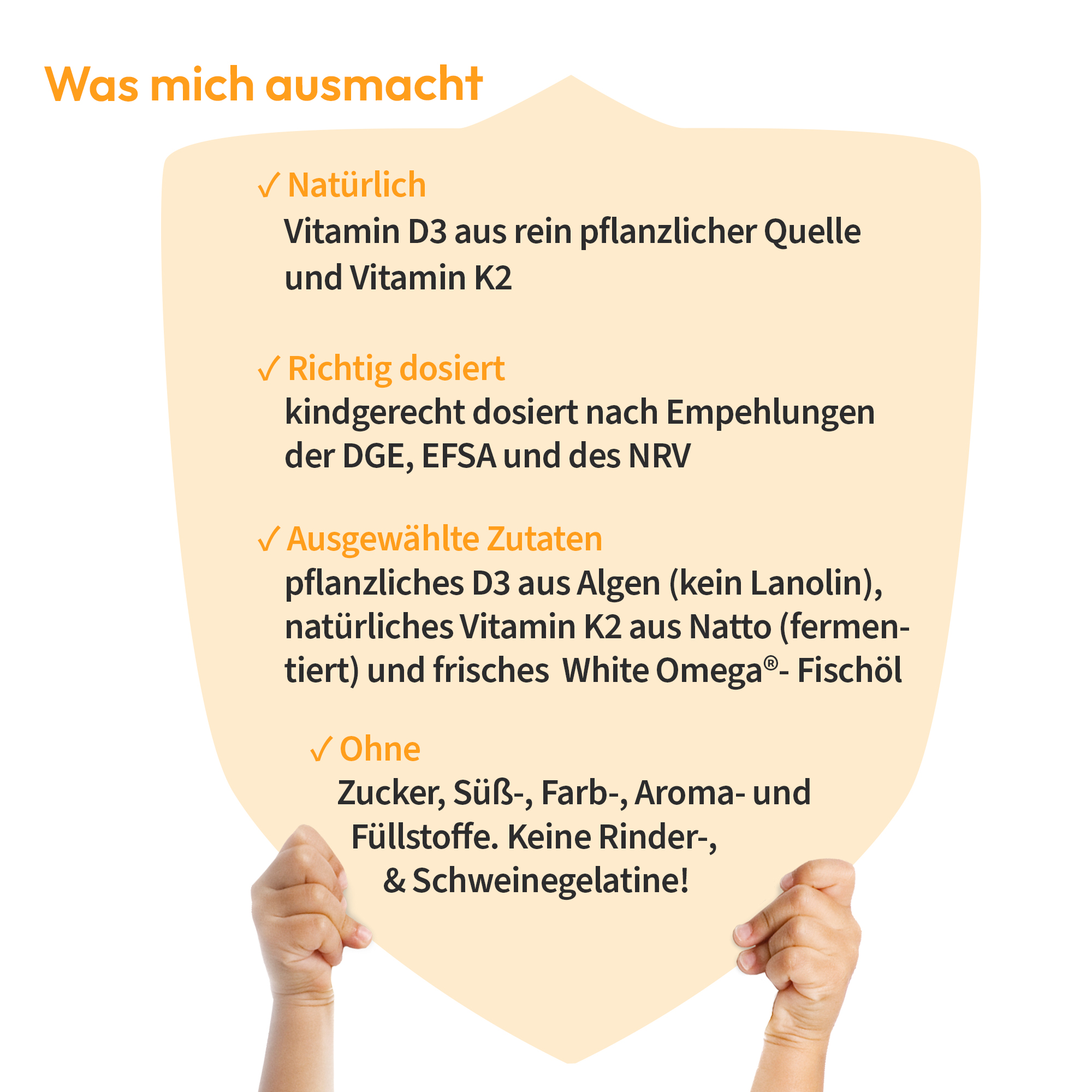 • Mit pflanzlichem Vitamin D3 aus Algen (kein Lanolin) und natürlichem Vitamin K2 aus Natto (Soja)