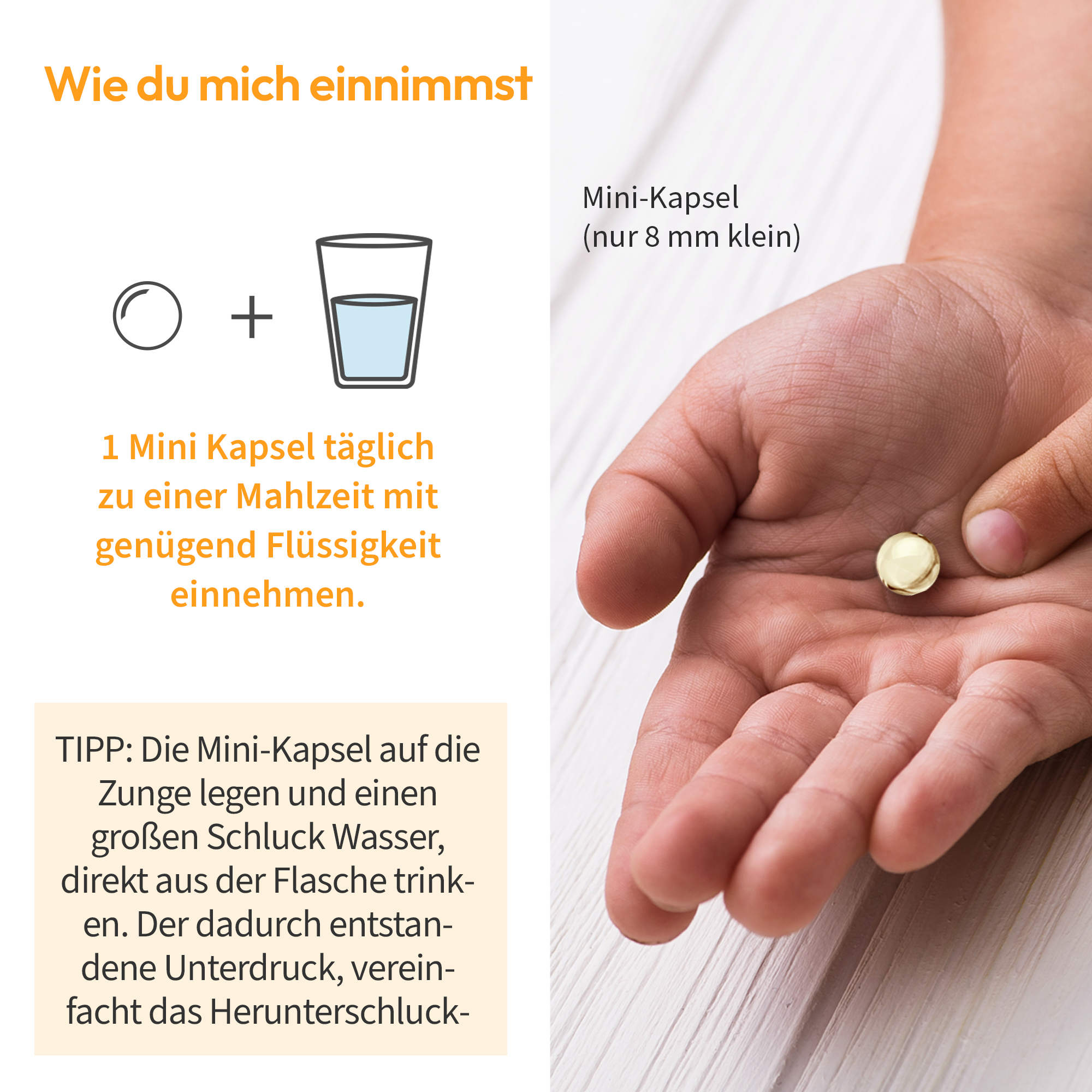 Vitamin D3 und K2 für Kinder, 45 Mini-Kapseln für 1,5 Monate, kindgerechte Dosierung von Vitamin D3 (20 µg/Kapsel) und Vitamin K2 (25 µg/Kapsel).