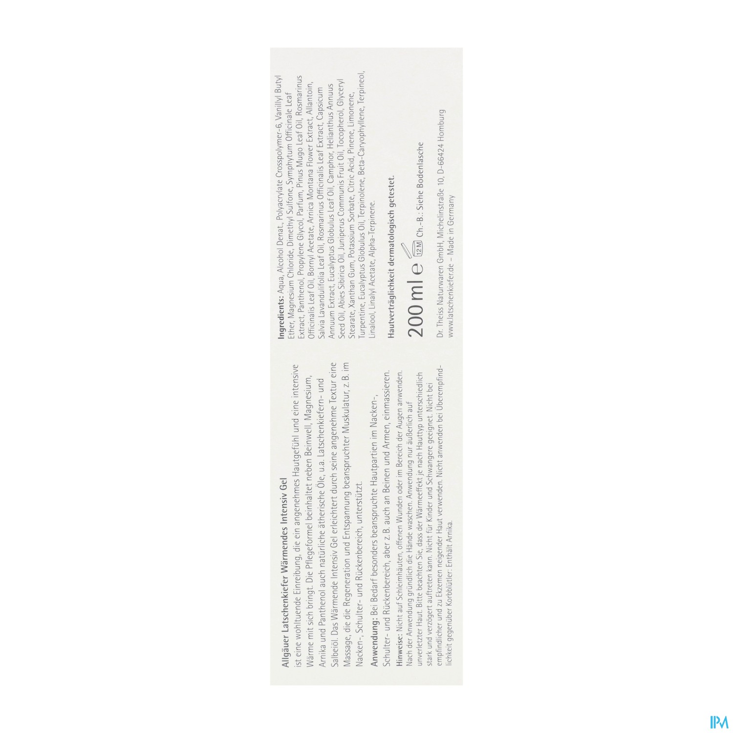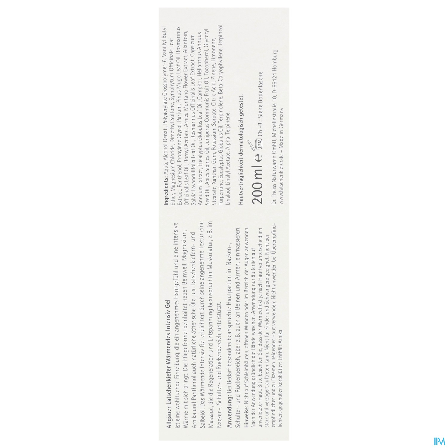 Allgäuer Latschenkiefer Wärmendes Intensiv Gelist eine wohltuende Einreibung, die ein angenehmes Hautgefühl und eine intensive Wärme mit sich bringt. Die Pflegeformel beinhaltet neben Beinwell, Magnesium, Arnika und Panthenol auch natürliche ätherische Öle, u.a. Latschenkiefern- und Salbeiöl. Das Wärmende Intensiv Gel erleichtert durch seine angenehme Textur eine Massage, die die Regeneration und Entspannung beanspruchter Muskulatur, z. B. im Nacken-, Schulterund Rückenbereich, unterstützt.