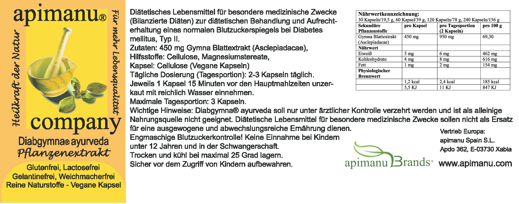 apimanu Diabgymna® ayurveda ist ein reines Naturprodukt und selbstverständlich frei von Schwermetallsubstanzen und Verunreinigungen. apimanu Diabgymna® ayurveda enthält KEINEN Zucker und ist Laktose-, Fructose- und Glutenfrei.