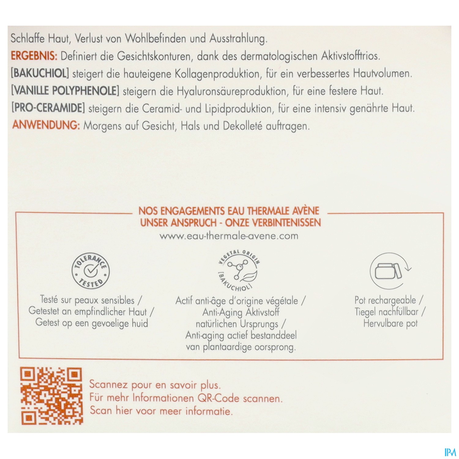 AVENE THERMAL SPRING WATER (AVENE AQUA). PENTAERYTHRITYL TETRACAPRYLATE/TETRACAPRATE. GLYCERIN. COCO-CAPRYLATE/CAPRATE. TRIBEHENIN PEG-20 ESTERS. BUTYROSPERMUM PARKII (SHEA) BUTTER (BUTYROSPERMUM PARKII BUTTER). METHYL GLUCETH-20. DIMETHICONE. GLYCERYL LINOLEATE. BEHENYL ALCOHOL. BIS-PEG-12 DIMETHICONE BEESWAX. POLYMETHYL METHACRYLATE. SIMMONDSIA CHINENSIS (JOJOBA) SEED OIL (SIMMONDSIA CHINENSIS SEED OIL). SORBITOL. BAKUCHIOL. BENZOIC ACID. BETA-CARYOPHYLLENE. CALCIUM CHLORIDE. CAPRYLIC/CAPRIC TRIGLYCERIDE. CAPRYLYL GLYCOL. CETEARETH-20. CETEARYL ALCOHOL. DIMETHICONE CROSSPOLYMER. DIMETHYL PHENETHYL ACETATE. DISODIUM EDTA. FRAGRANCE (PARFUM). GLYCERYL LINOLENATE. GLYCERYL OLEATE. GLYCERYL PALMITATE. GLYCERYL STEARATE. GLYCINE SOJA (SOYBEAN) OIL (GLYCINE SOJA OIL). HELIANTHUS ANNUUS (SUNFLOWER) SEED OIL (HELIANTHUS ANNUUS SEED OIL). HYDROGENATED POLYISOBUTENE. HYDROXYETHYL ACRYLATE/SODIUM ACRYLOYLDIMETHYL TAURATE COPOLYMER. LINALOOL. MICA. PEG-7 TRIMETHYLOLPROPANE COCONUT ETHER. PROPYLENE GLYCOL. SILICA. SODIUM HYDROXIDE. SODIUM STEARATE. SODIUM STEAROYL GLUTAMATE. SORBITAN ISOSTEARATE. TERPINEOL. TITANIUM DIOXIDE (CI 77891). TOCOPHEROL. TOCOPHERYL GLUCOSIDE. VANILLA TAHITENSIS FRUIT EXTRACT. WATER (AQUA)