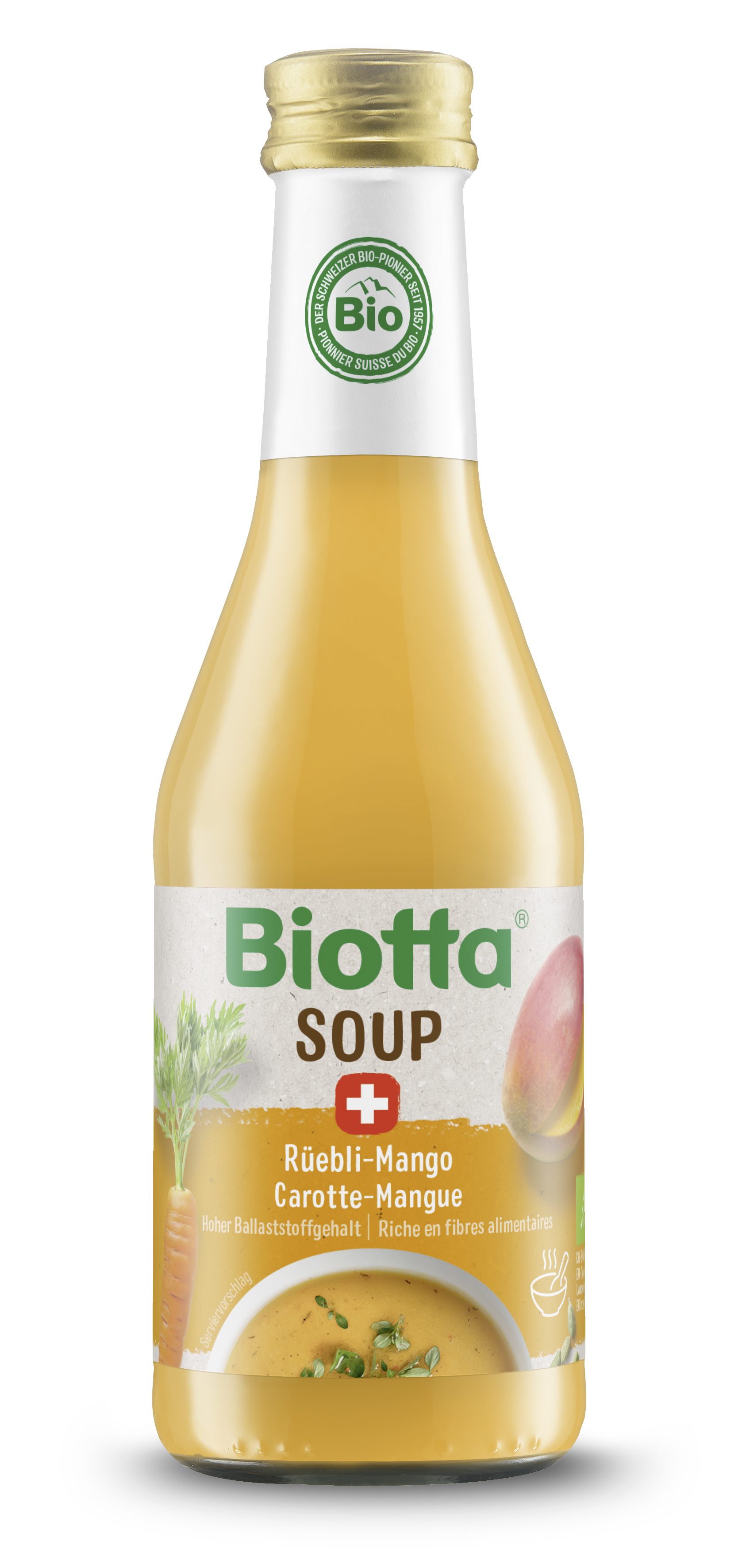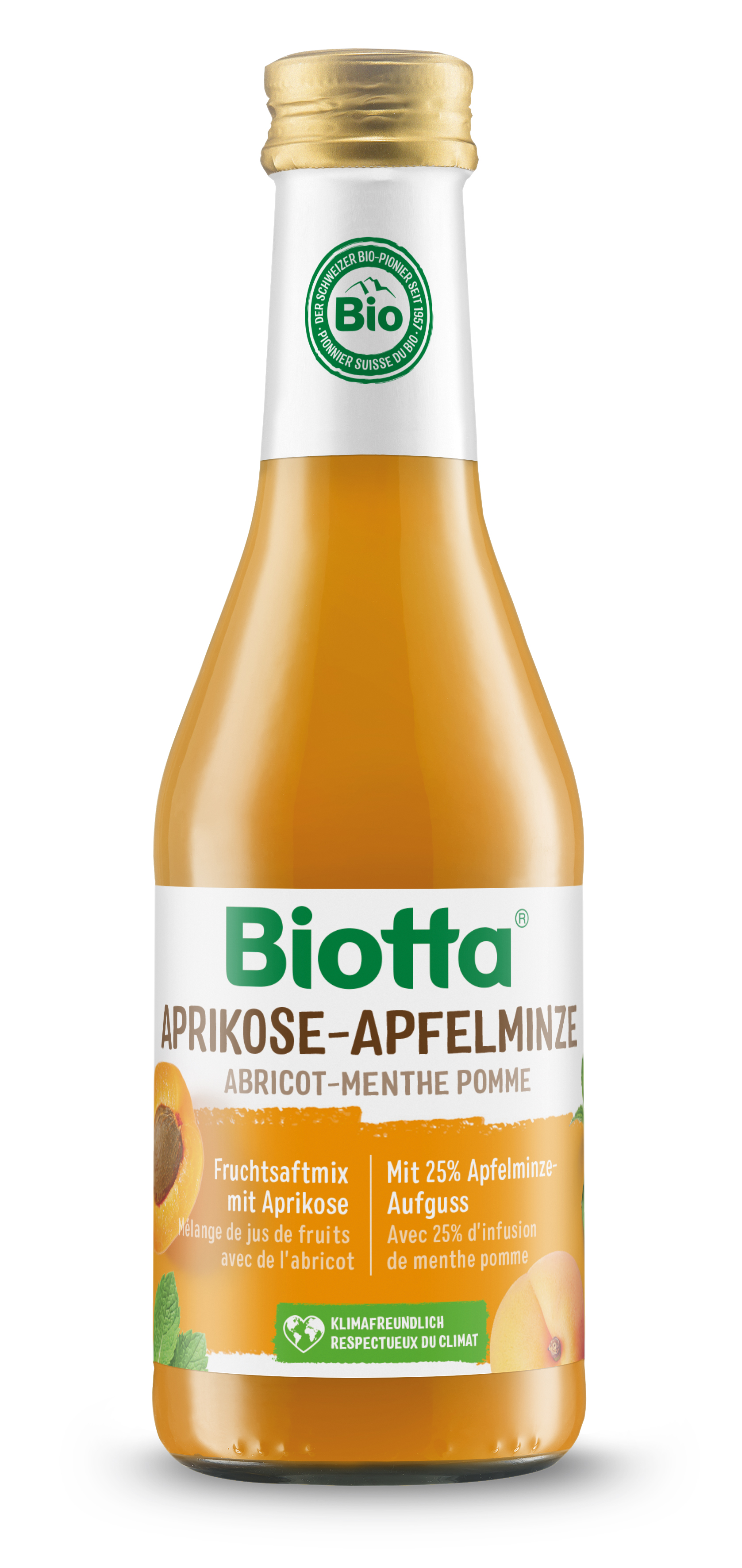 Bete-Saft*, Sonnenblumenkernprotein*, Zitronen Biotta Kartoffel Suppe Bio Kartoffelsuppe. Zutaten: Kartoffelsaft* (56%) (CH), natürliches Mineralwasser, Kokosmilch*, Mangopüree*, Sonnenblumenkernprotein*, Säuerungsmittel: Milchsäure, Stabilisator: Pektin, Meersalz, Gewürze*. Pasteurisiert. *aus biologischem Anbau Biotta Frühstück Saft Bio Fruchtsaftcocktail mit Fruchtpürees und Weissteeauszug. Zutaten: Orangensaft*, Traubensaft*, Weissteeauszug* (14%), Bananenpüree* (13.5%), Mango-püree* (13%), Stabilisator: Pektin. Pasteurisiert. *aus biologischem Anbau Biotta Aprikose-Apfelminze Saft Bio Cocktail aus Fruchtsaft und -püree mit Apfelminze-Auszug. Zutaten: Traubensaft*,