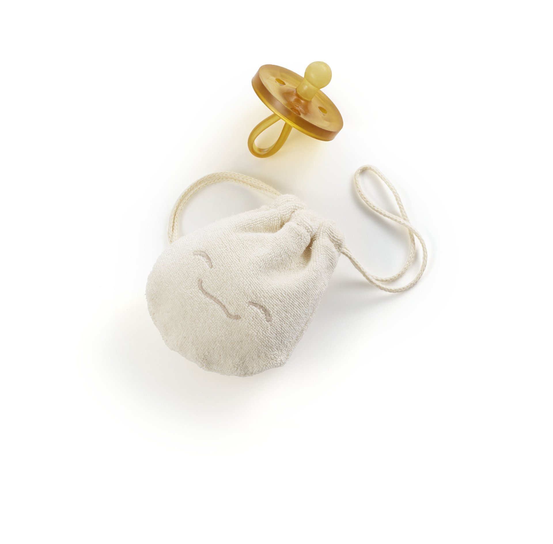 PaciPouch der Aufbewahrungsbeutel ist in einer neutralen Farbe gehalten, besteht aus 100% GOTS-Zertifizierter Biobaumwolle und ist im selben Design wie unser PaciPixy.