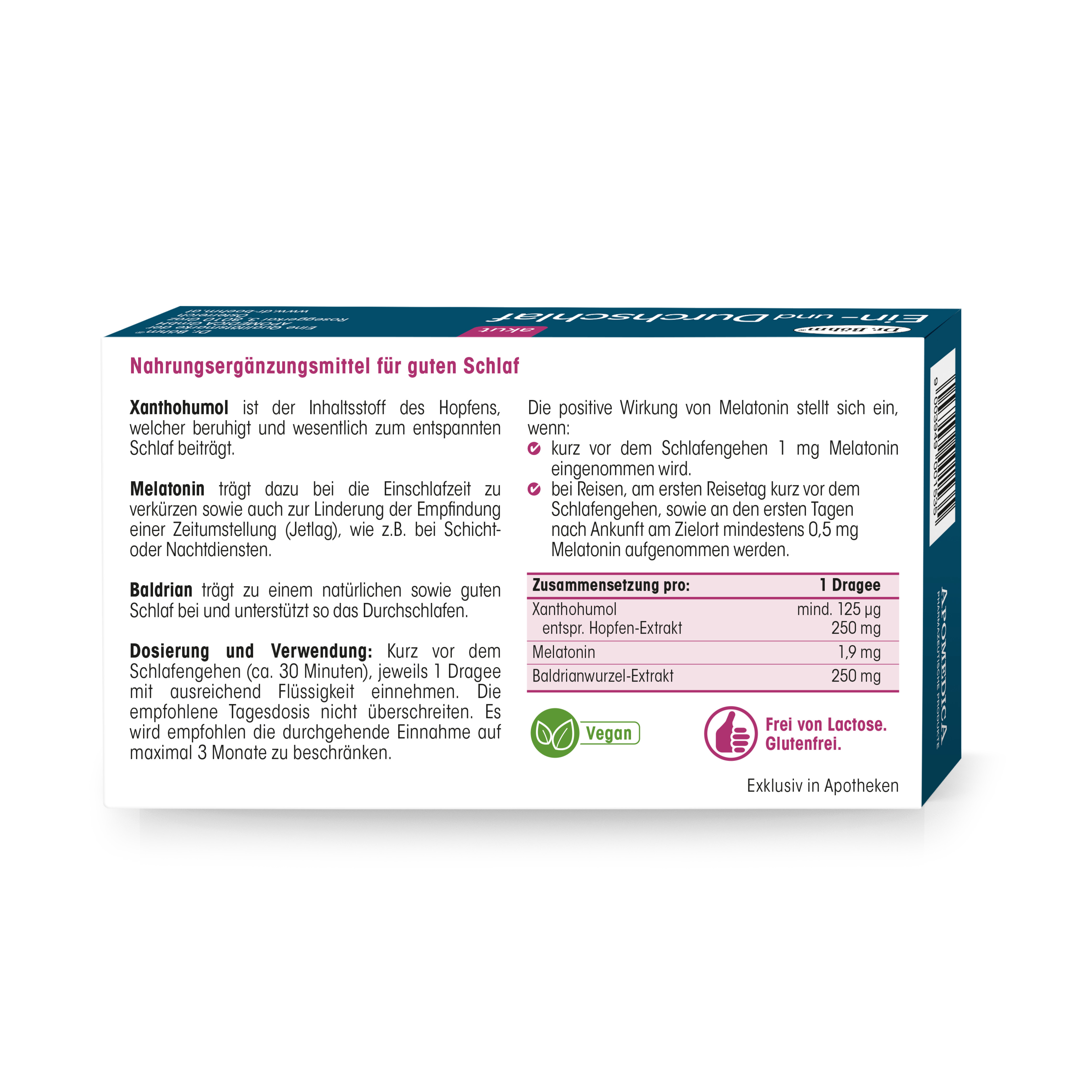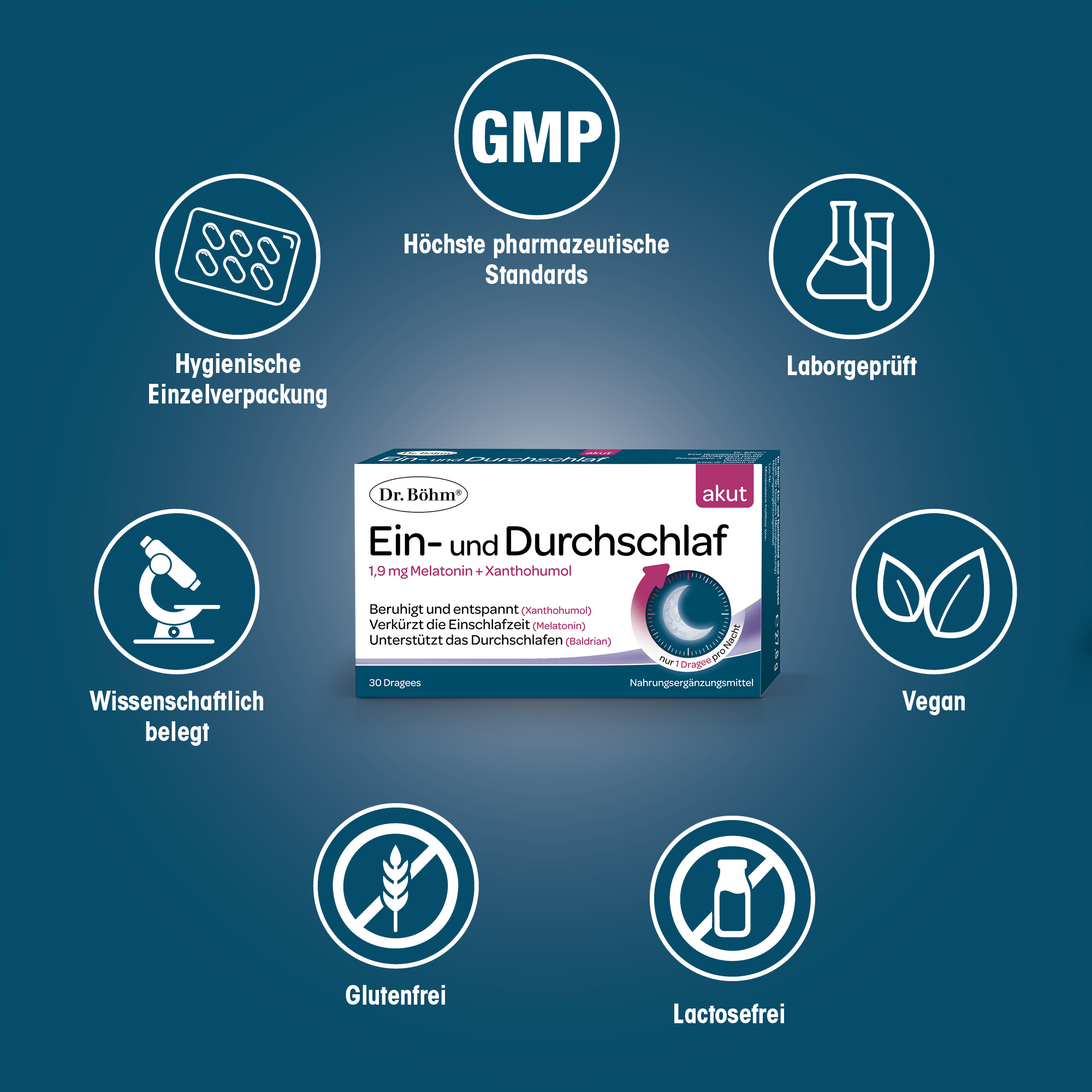 Dr. Böhm® Ein- und Durchschlaf akut enthält neben Melatonin für rasches Einschlafen und beruhigendem Hopfen auch schlaffördernden Baldrian. Schon eines der leicht schluckbaren Dragees vor dem Schlafengehen verkürzt die Einschlafzeit und fördert das Durschlafen.