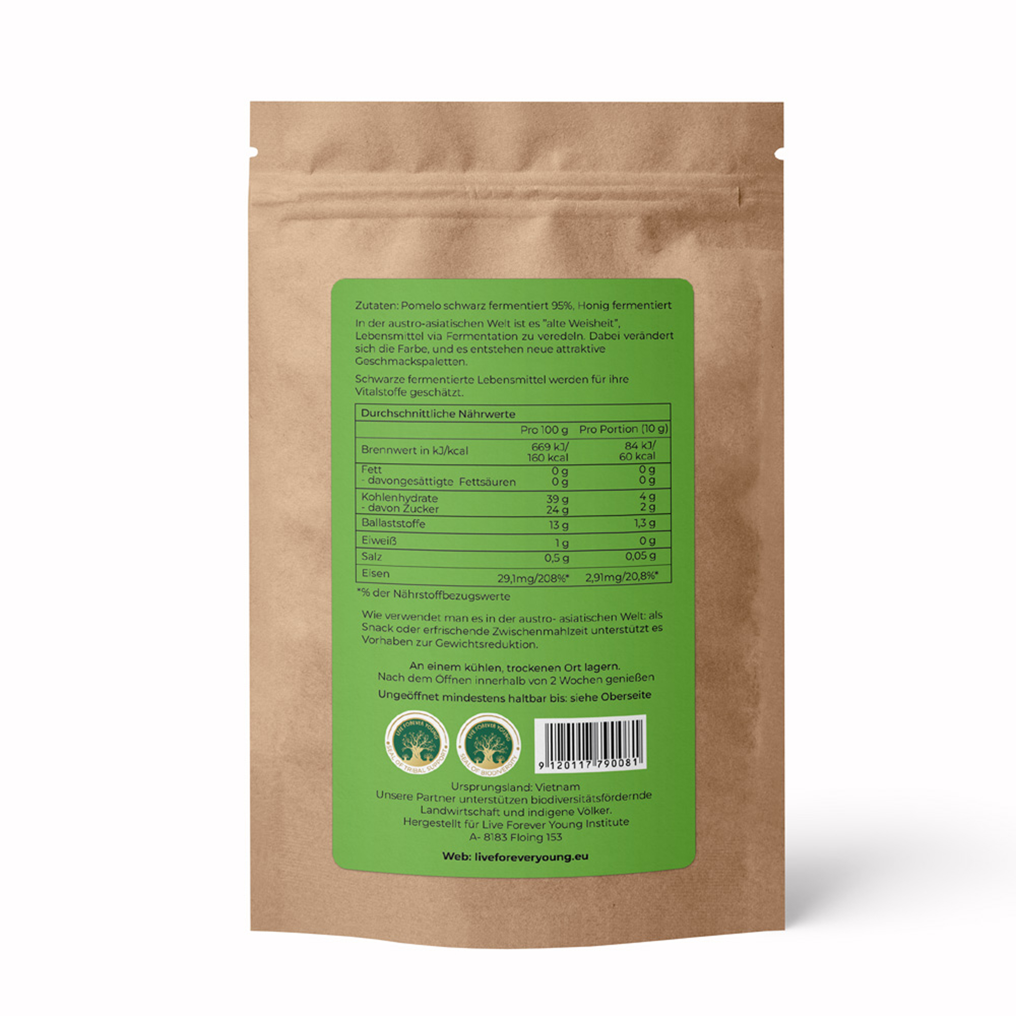 Live Forever Young fermentierte Pomelo ist eine wahre Geschmacksexplosion – mit saftiger Süße und einem feinherben Aroma, das begeistert. Durch ein besonderes Fermentationsverfahren entfaltet die Frucht ihre natürlichen Aromen und wird zu einem einzigartigen Genusserlebnis.
