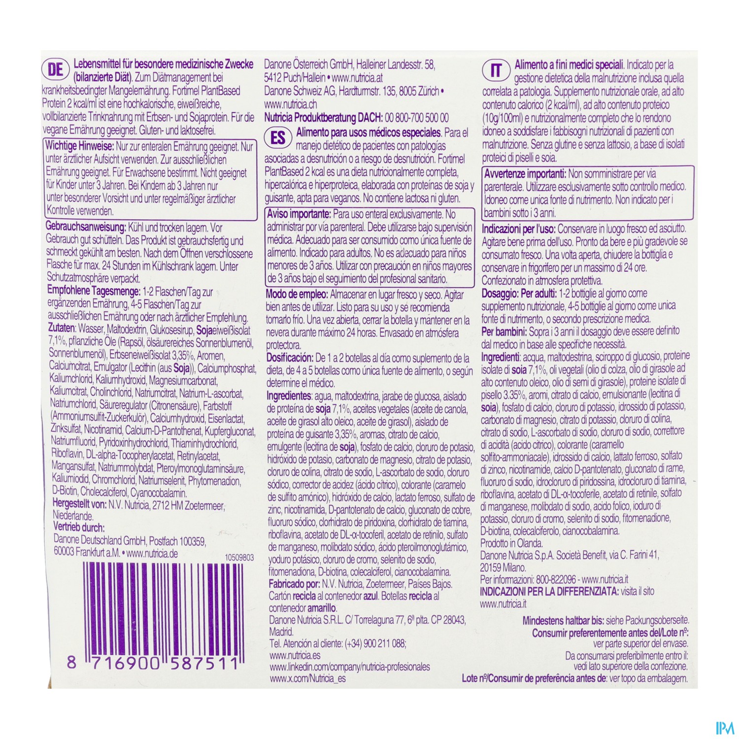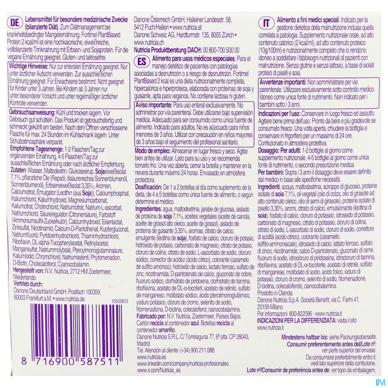 Wasser, Maltodextrin, Glucosesirup, SOJAeiweißisolat 7,1 %, pflanzliche Öle (Rapsöl, ölsäurehaltiges Sonnenblumenöl, Sonnenblumenöl), Erbseneiweißisolat 3,35%, Aromen, Calciumcitrat, Emulgator (Lecithin (aus SOJA)), Calciumphosphat, Kaliumchlorid, Kaliumhydroxid, Magnesiumcarbonat, Kaliumcitrat, Cholinchlorid, Natriumcitrat, Natrium-L-ascorbat, Natriumchlorid, Säureregulator (Citronensäure), Farbstoff (Ammoniumsulfit-Zuckerkulör), Calciumhydroxid, Eisenlactat, Zinksulfat, Nicotinamid, Calcium-D-Pantothenat, Kupfergluconat, Natriumfluorid, Pyridoxinhydrochlorid, Thiaminhydrochlorid, Riboflavin, DL-α-Tocopherylacetat, Retinylacetat, Mangansulfat, Natriummolybdat, Pteroylmonoglutaminsäure, Kaliumiodid, Chromchlorid, Natriumselenit, Phytomenadion, D-Biotin, Cholecalciferol, Cyanocobalamin.