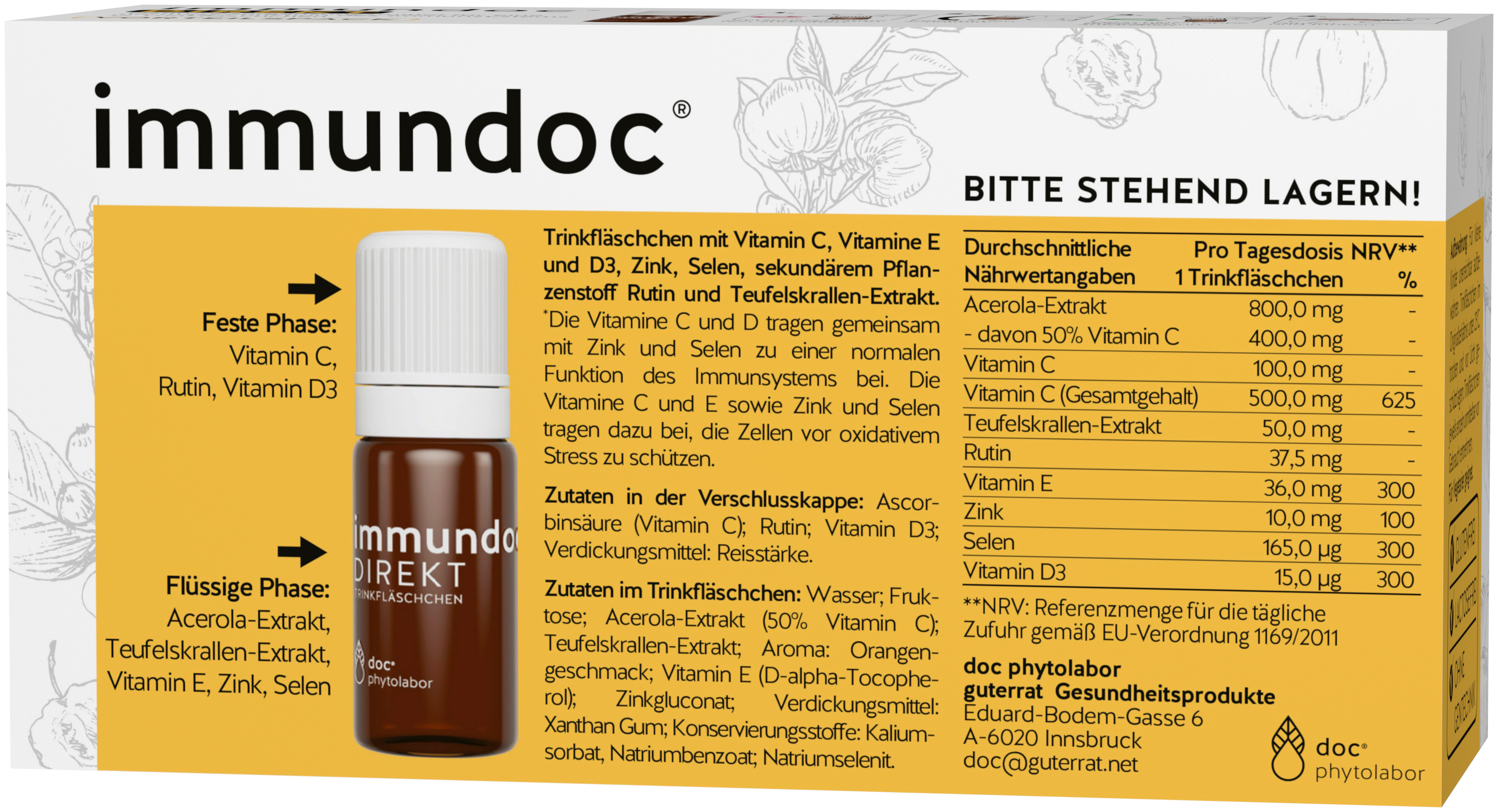 Flüssige Phase: Acerola-Extrakt, Teufelskrallen-Extrakt, Vitamin E, Zink, Selen