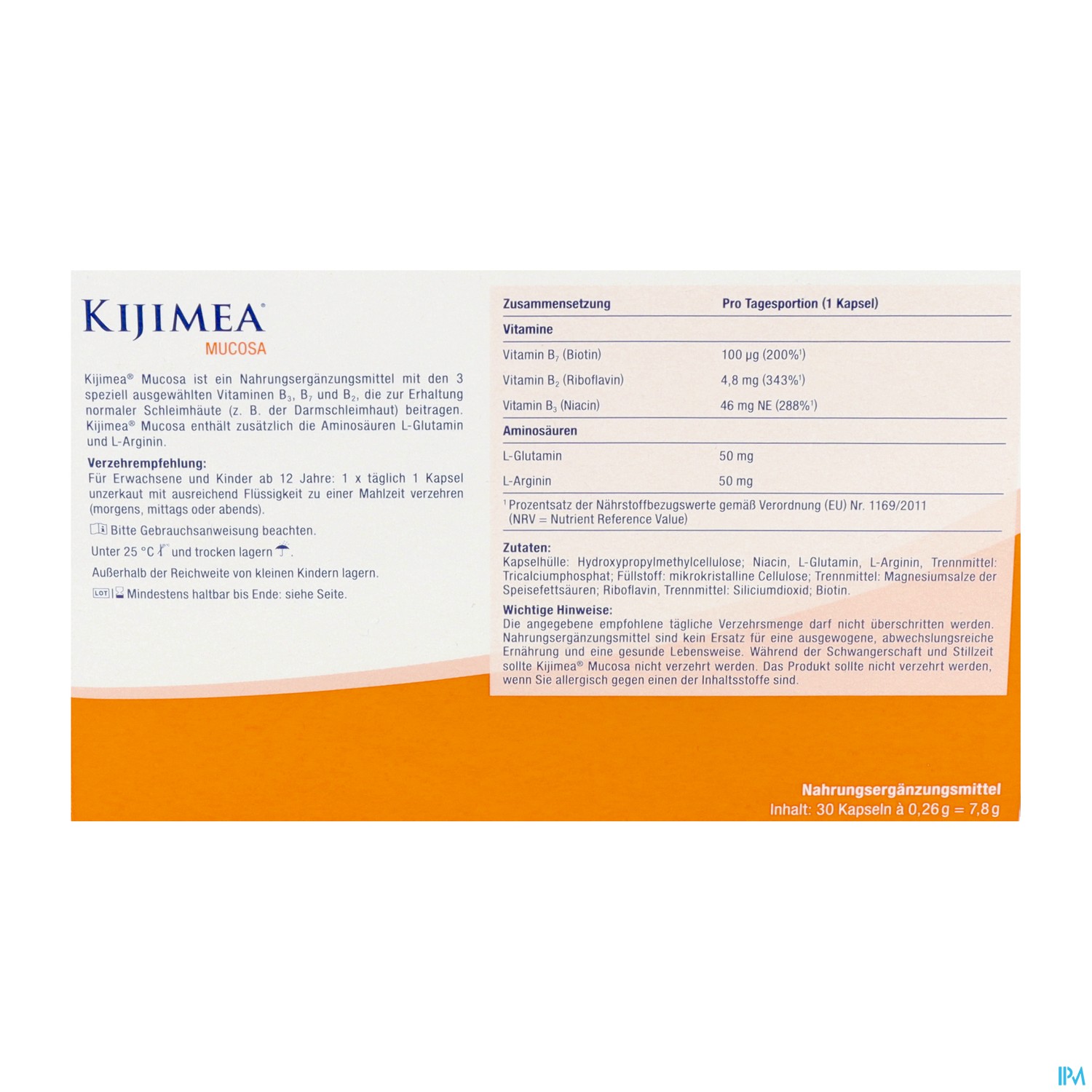 Kijimea Mucosa ist ein Nahrungsergänzungsmittel mit den 3 speziell ausgewählten Vitaminen B3, B7 und B2, die zur Erhaltung normaler Schleimhäute beitragen. Kijimea Mucosa enthält zusätzlich die für den Darm wichtigen Aminosäuren L-Glutamin und L-Arginin.