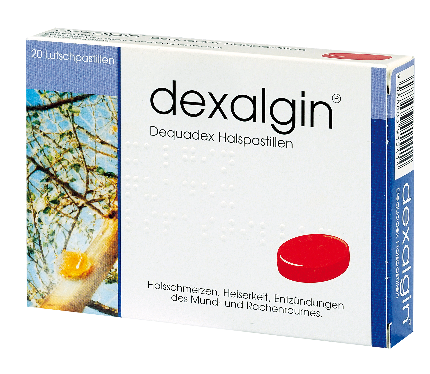 dexalgin Dequadex Halspastillen werden angewendet zur unterstützenden Behandlung von Entzündungen im Mund- und Rachenraum (Halsschmerzen, Heiserkeit, Entzündungen der Mundschleimhaut).