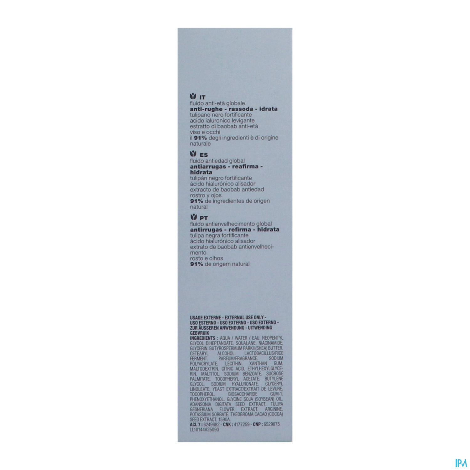 Dank einer einzigartigen Wirkstoffkombination aus patentierter schwarzer Tulpe, Baobab-Extrakt und Hyaluronsäure korrigiert es alle Zeichen der Hautalterung (Falten, Spannkraftverlust, Trockenheit), spendet Feuchtigkeit und schützt die Haut. P.S. Auch die Augenkontur profitiert davon!