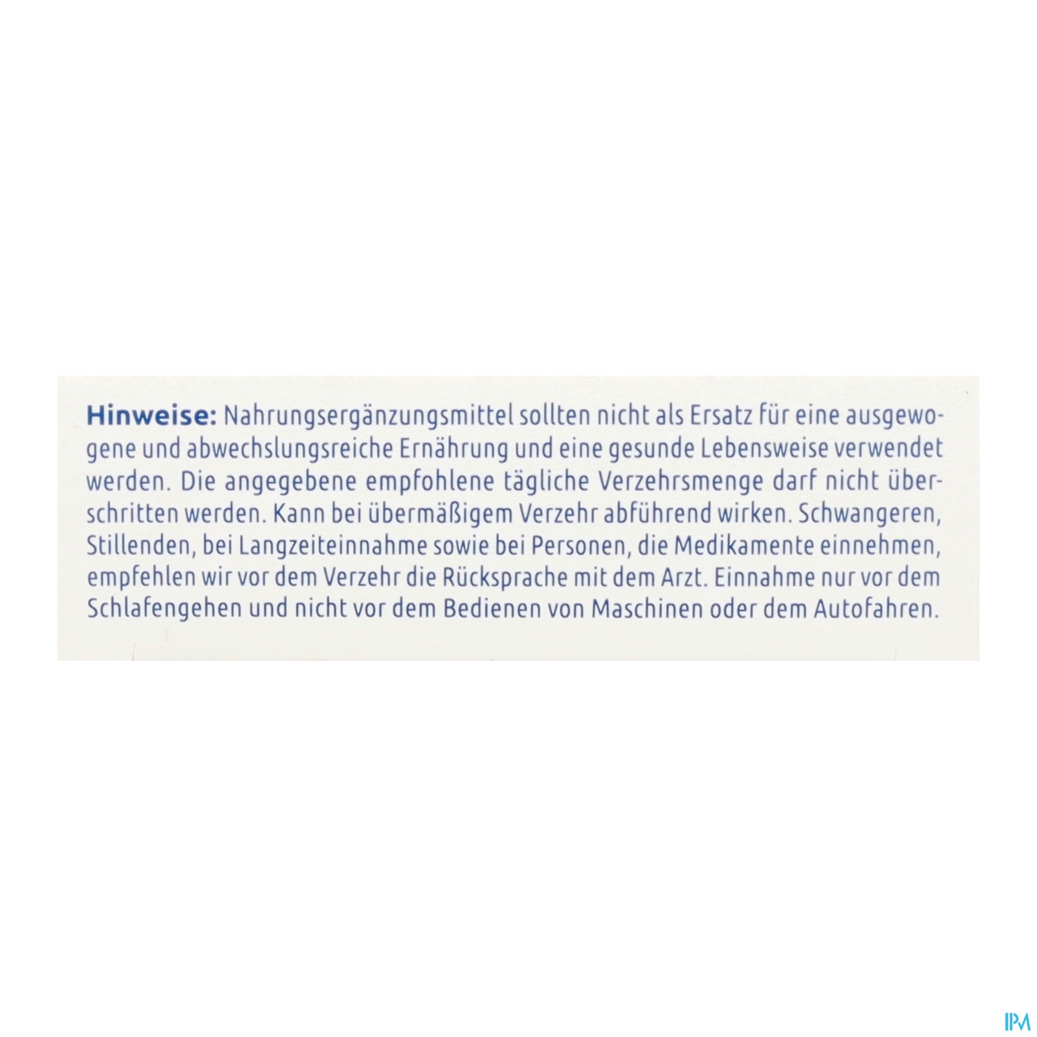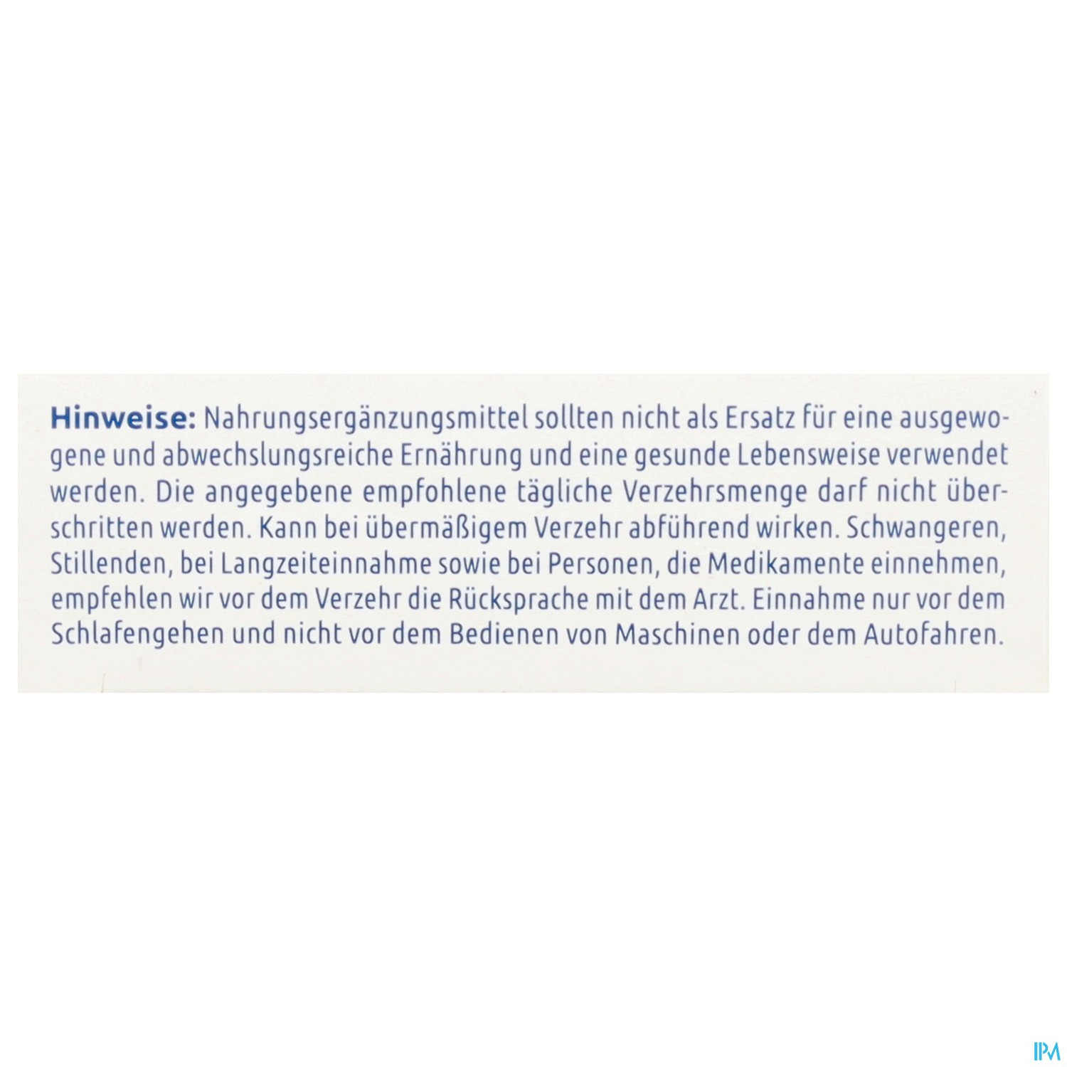 Nahrungsergänzungsmittel sollten nicht als Ersatz für eine ausgewogene und abwechslungsreiche Ernährung und eine gesunde Lebensweise verwendet werden. Die angegebene empfohlene tägliche Verzehrmenge darf nicht überschritten werden. Schwangeren, Stillenden, bei Langzeiteinnahme sowie bei Personen, die Medikamente einnehmen, empfehlen wir vor dem Verzehr die Rücksprache mit dem Arzt. Nur zum Verzehr durch Erwachsene bestimmt. Einnahme nur vor dem Schlafengehen und nicht vor dem Bedienen von Maschinen oder dem Autofahren.