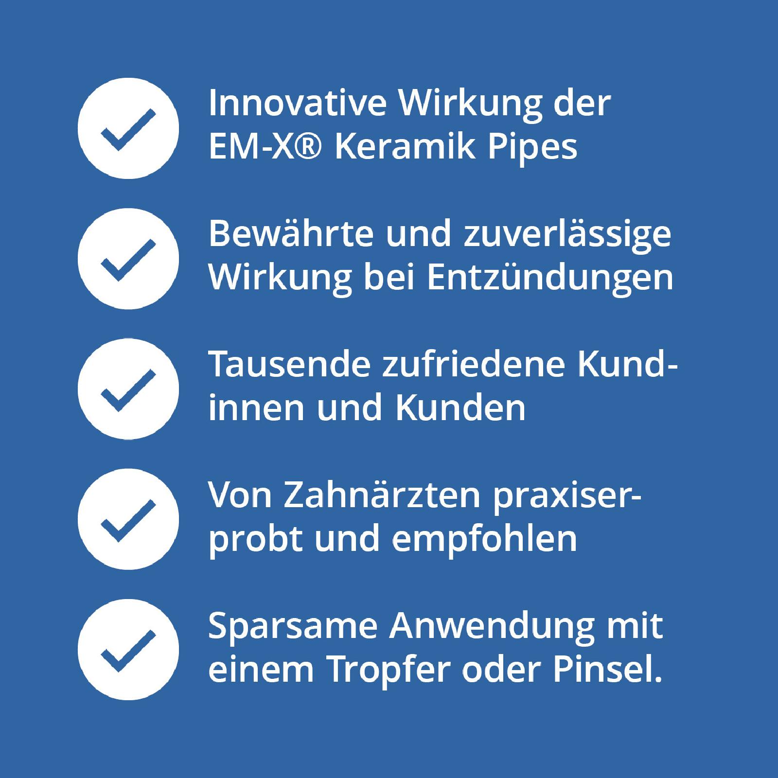 Aufgrund der antioxidativen Wirkung der enthaltenen EM-X® Keramik Pipes werden schädliche oxidative Vorgänge bei Entzündungen gelindert. Die feinenergetischen Resonanzen der EM-X® Keramik Pipes sorgen für eine gesunde und stabile Mundflora. Mund-Gesund Fluid+ ist von Zahnärzten praxiserprobt und empfohlen.