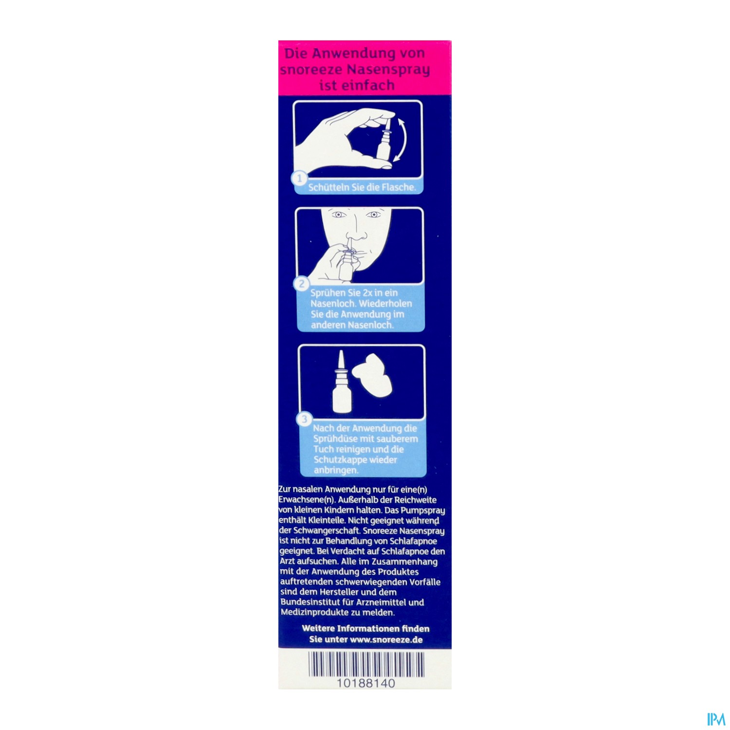 Nur für die nasale Anwendung durch einen Erwachsenen. Außerhalb der Reichweite von kleinen Kindern aufbewahren. Die Sprühpumpe enthält Kleinteile. An einem kühlen, trockenen Ort unter 25°C lagern. Snoreeze Nasenspray sollte bei Raumtemperatur verwendet werden. Snoreeze empfiehlt, wenn Sie schwanger sind oder stillen, vor der Anwendung Ihren Arzt aufzusuchen.