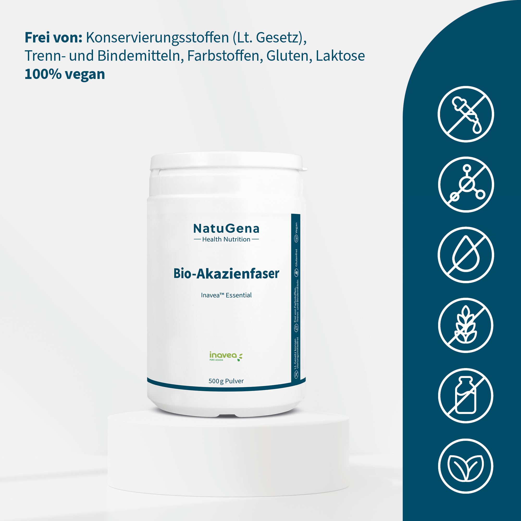 NatuGena Bio-Akazienfaser ist ein fein lösliches Pulver aus kontrolliert biologischem Anbau. Es besteht aus dem Markenrohstoff Inavea™ Essential und liefert reine, lösliche Ballaststoffe pflanzlichen Ursprungs. Die Faser ist geschmacksneutral, gut verträglich und einfach in der Anwendung.