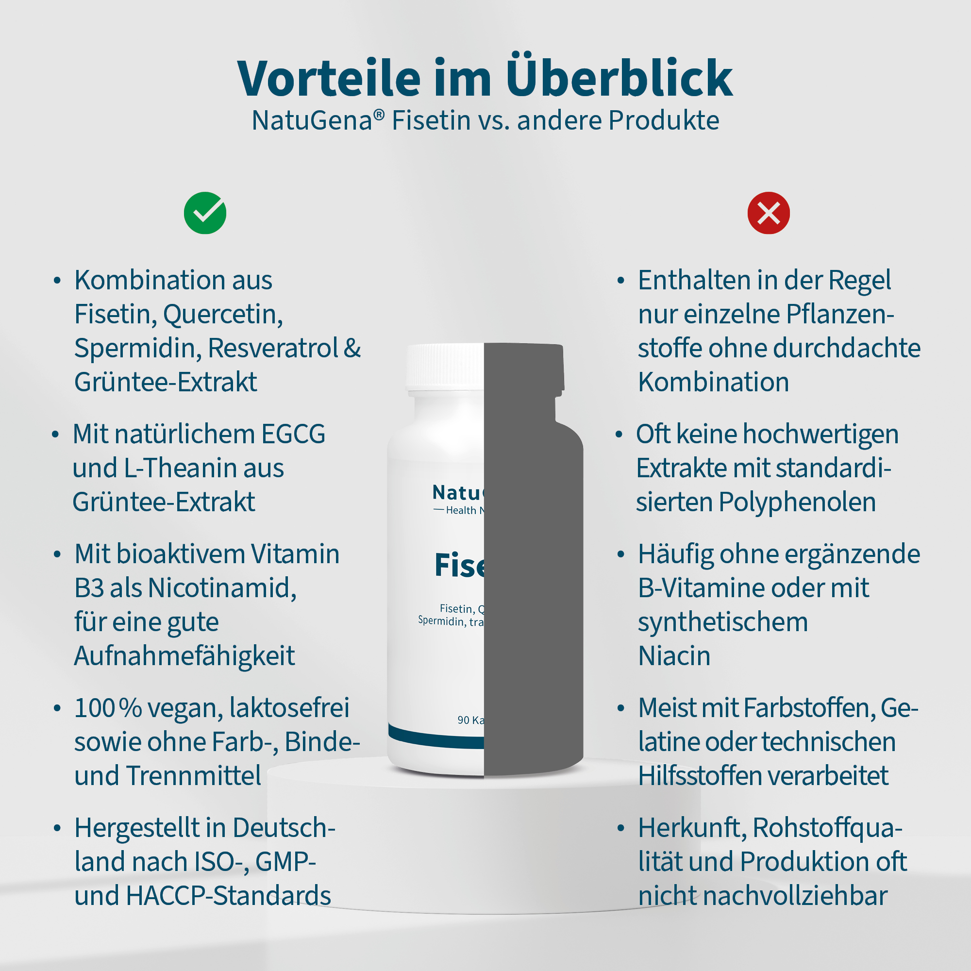 Die Zusammensetzung von NatuGena Fisetin kombiniert pflanzliche Verbindungen mit Vitamin B3. Enthalten sind Fisetin, Spermidin, Quercetin, ein Grüntee-Extrakt mit EGCG, trans-Resveratrol, L-Theanin sowie Niacin.