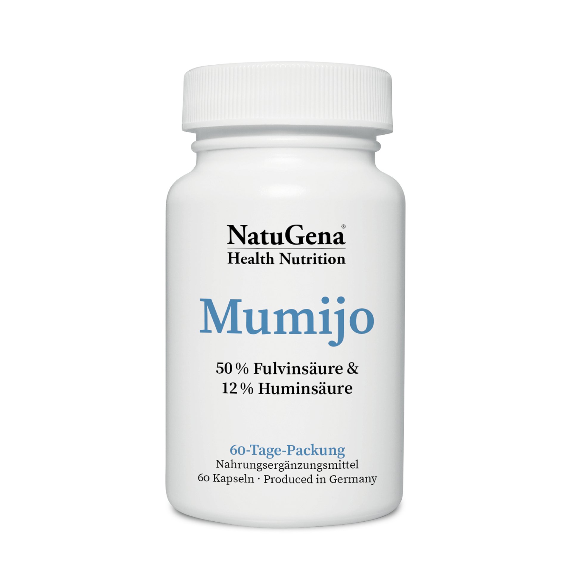 Mumijo von NatuGena mit 50 % Fulvinsäure und 12 % Huminsäure. Das Produkt ist farbstofffrei, glutenfrei, laktosefrei, trenn- und bindemittelfrei und 100 % vegan.