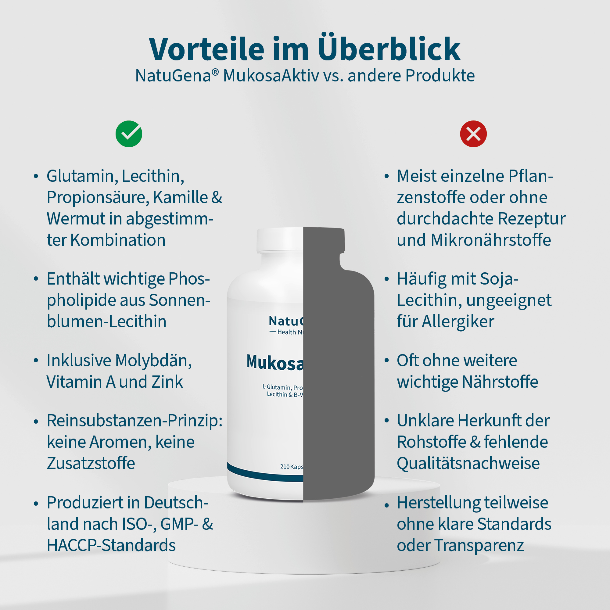 NatuGena MukosaAktiv enthält eine Kombination aus Aminosäuren, Mikronährstoffen und pflanzlichen Bestandteilen. Im Fokus stehen L-Glutamin und L-Alanyl-L-Glutamin. L-Glutamin ist eine semi-essentielle Aminosäure und zählt im Körper zu den am häufigsten vorkommenden Aminosäuren, besonders im Muskel- und Gewebehaushalt. L-Alanyl-L-Glutamin ist ein gut lösliches Dipeptid aus Alanin und Glutamin und dient als stabile Form von Glutamin.